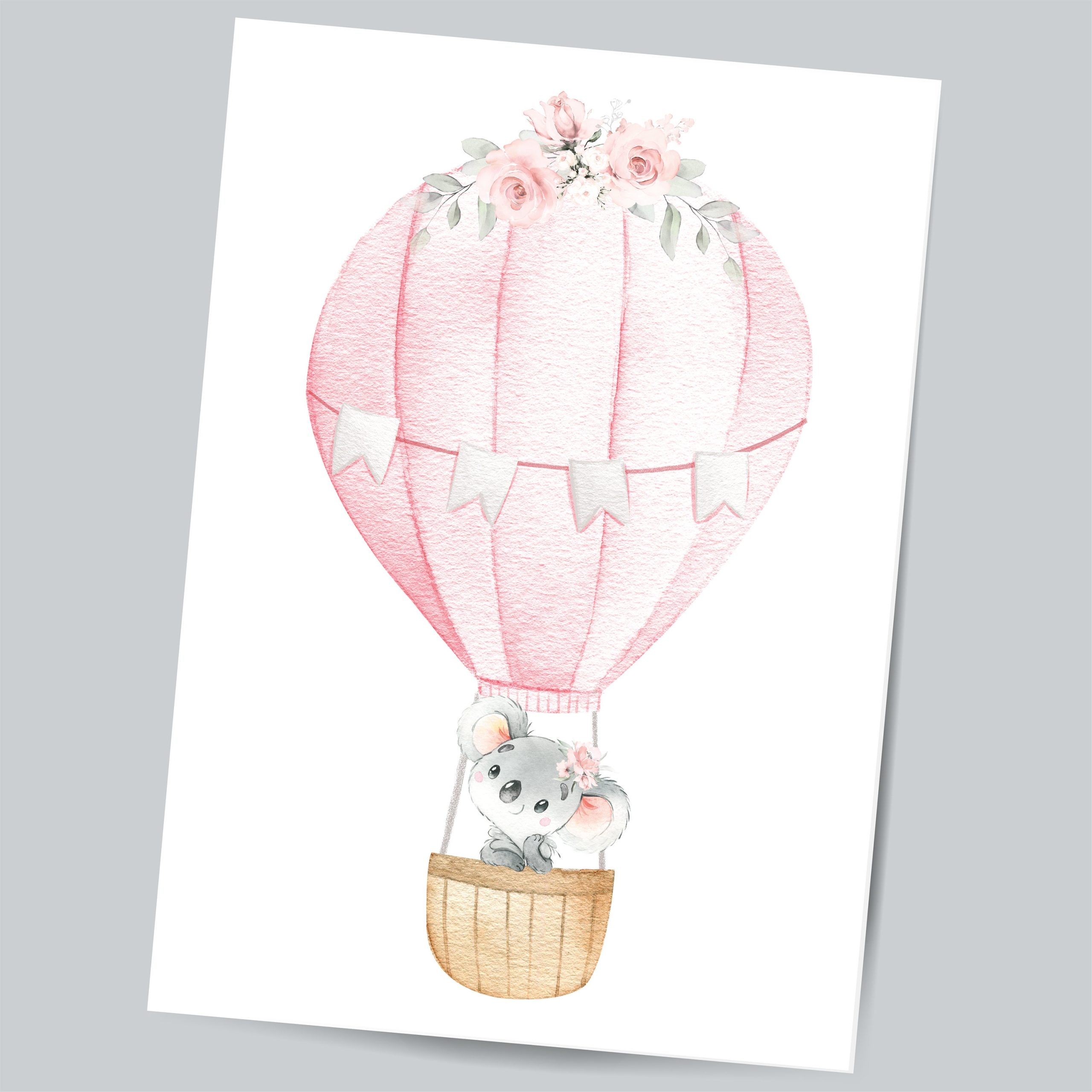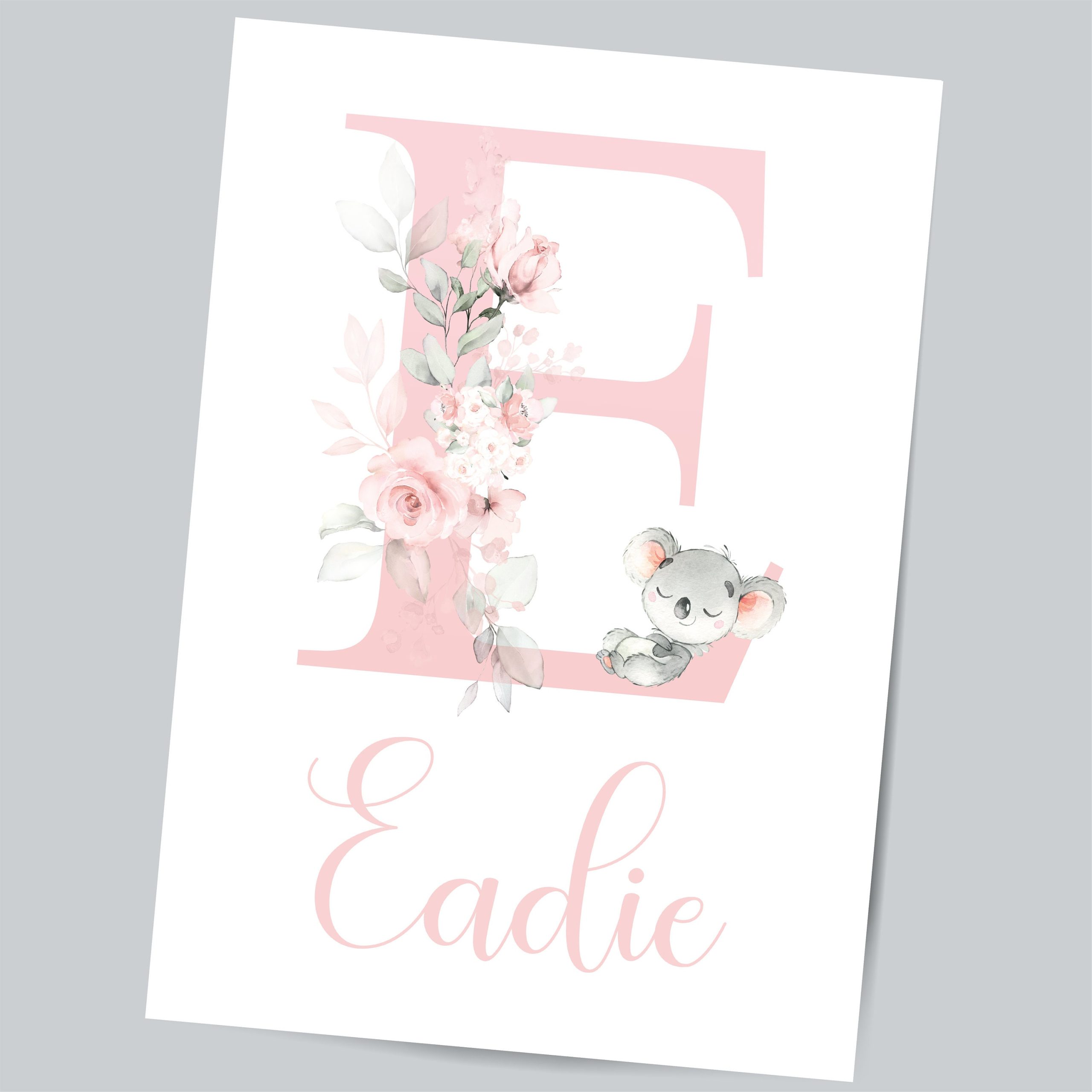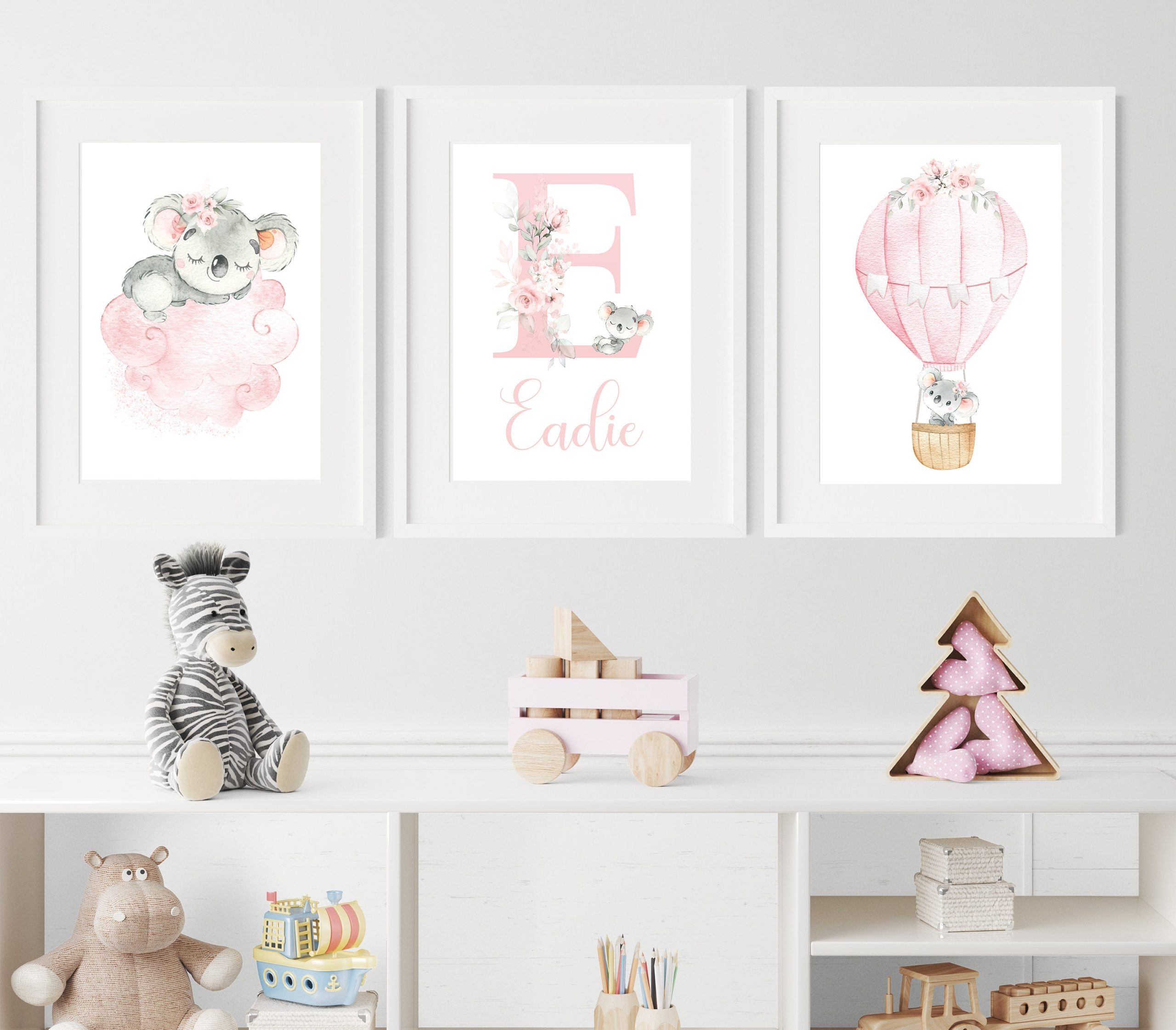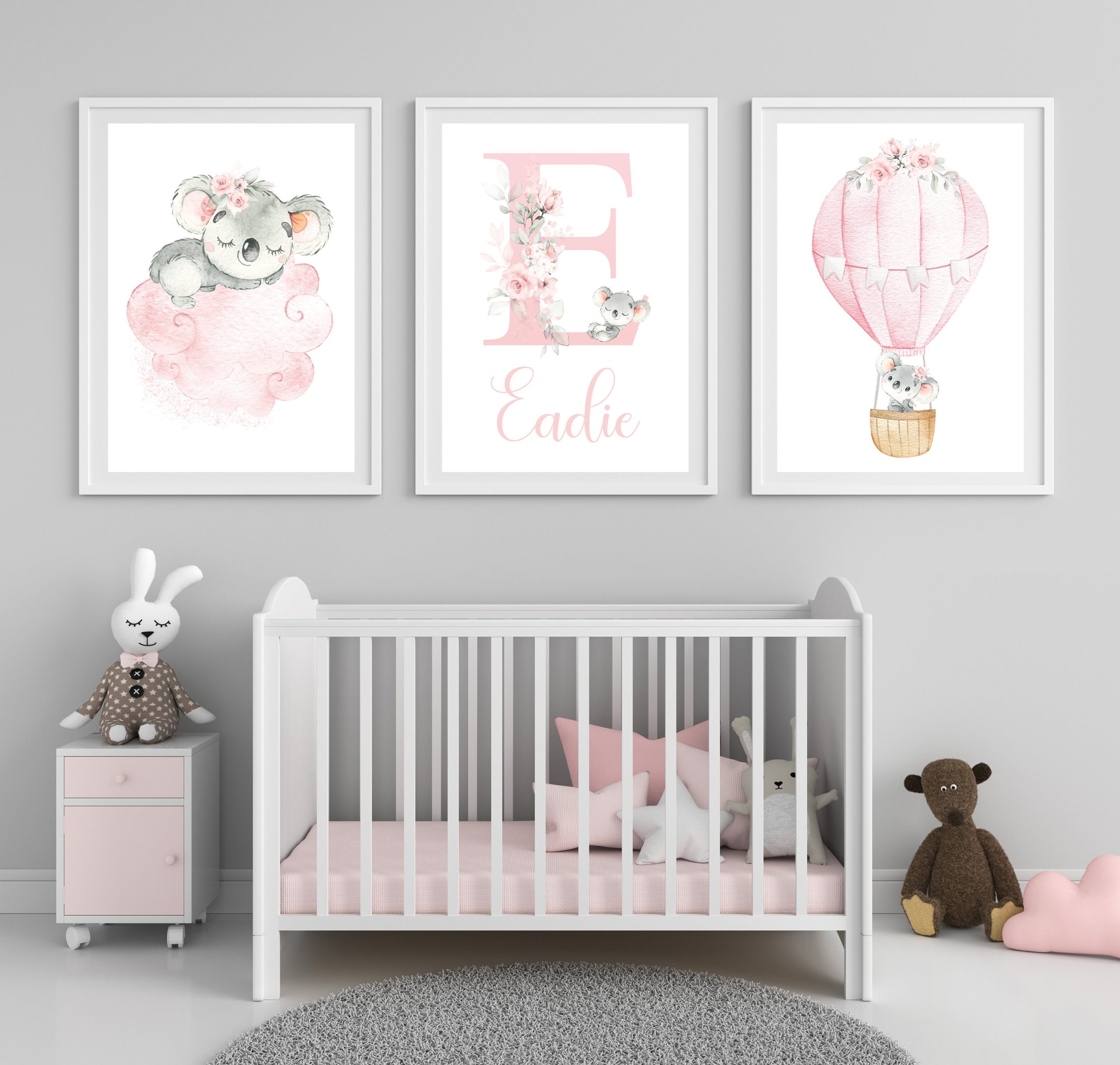 This Personalised Koala print set features three prints with hand drawn illustrations of baby Koala Bears, Large initial and Little One’s Name. The Pink and grey colours used to create these adorable playful Koala nursery art prints makes this set a perfect choice for a baby girl’s nursery, toddlers bedroom or playroom.