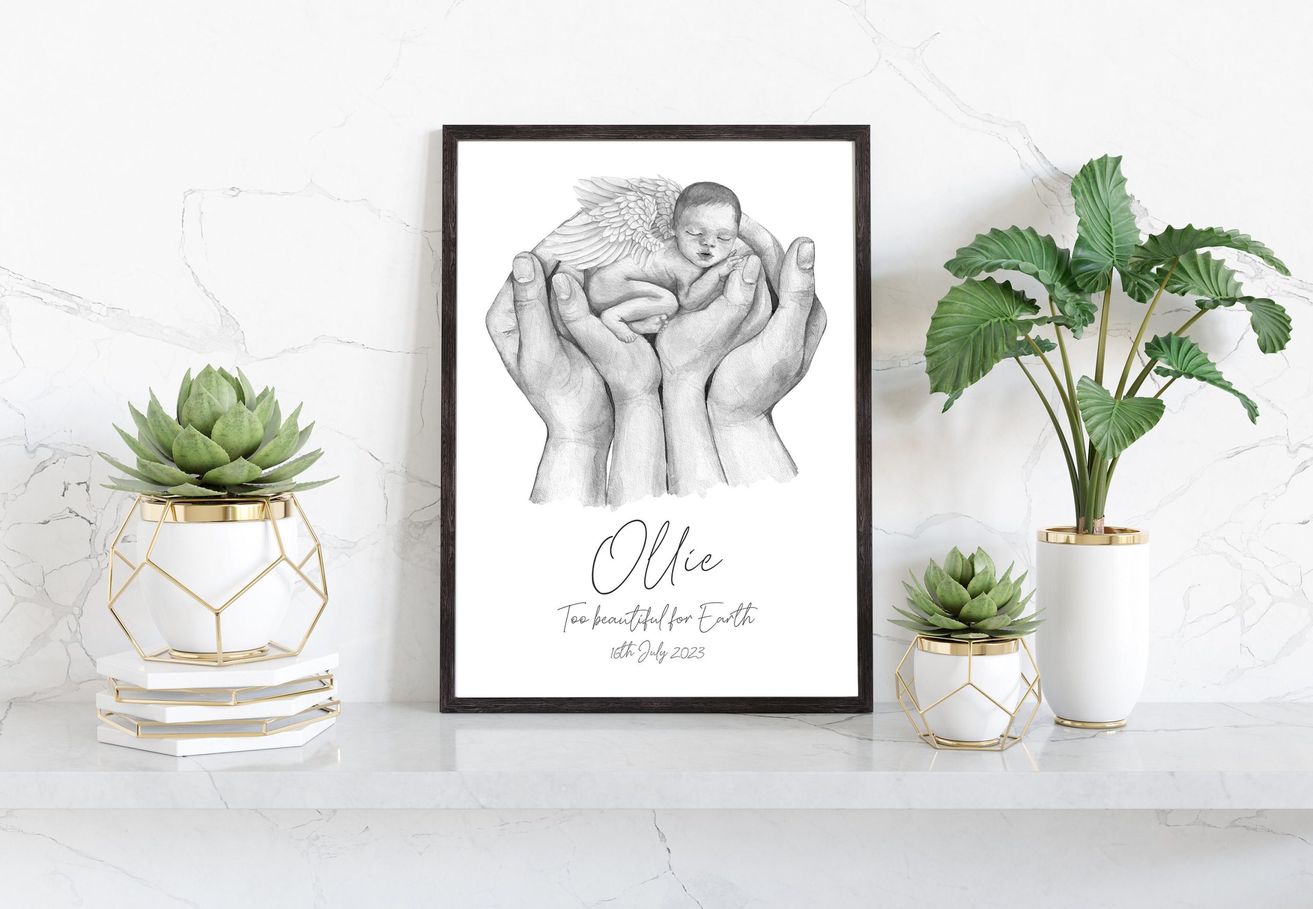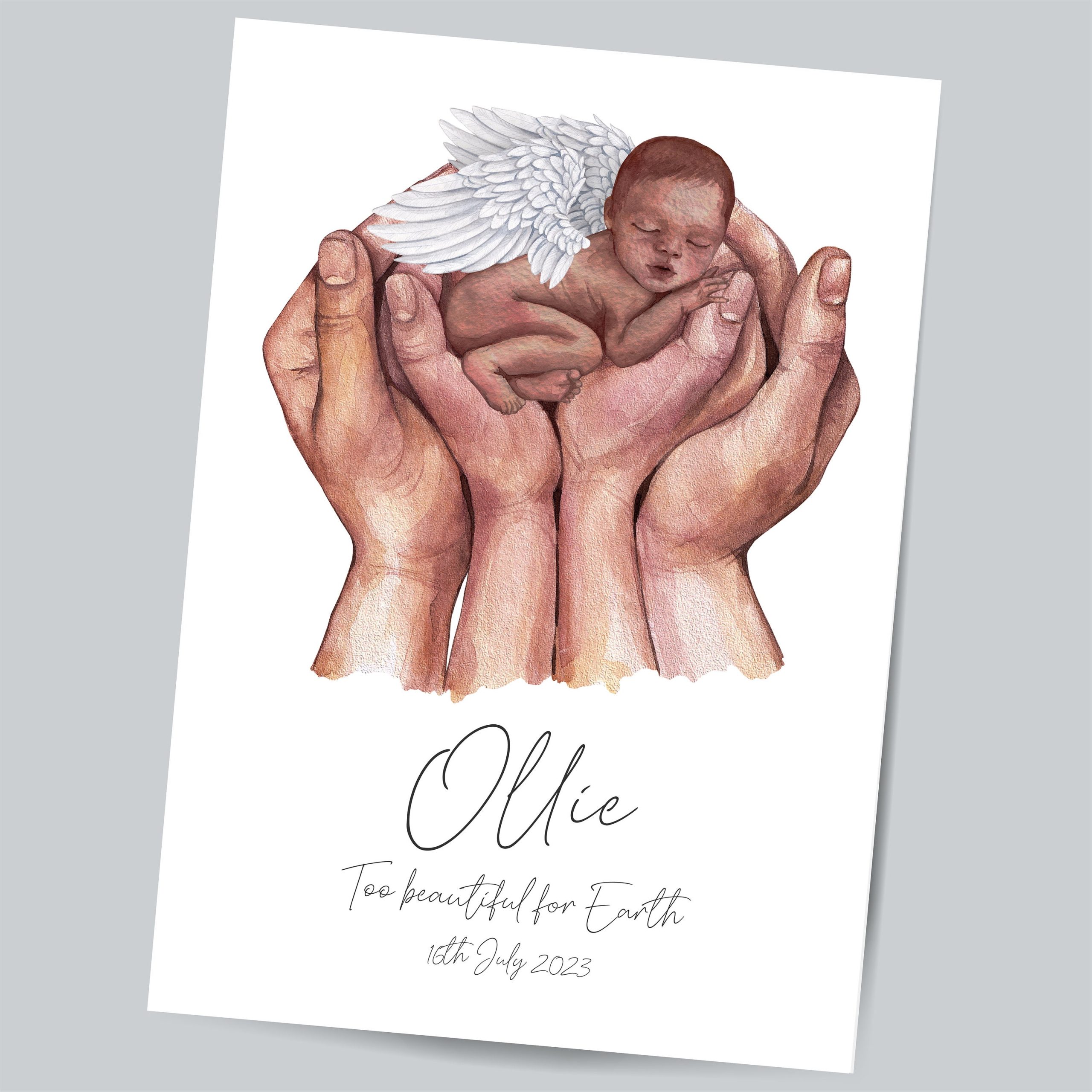 A One-of-a-kind meaningful keepsake for pregnancies and births without the happy ending. This stunning print is available in 3 shades, from light to dark skin tones and one monochrome shade personalised with your own wording of choice. The print has the wording, ‘Fly high beautiful Angel’ with your personalisation, e.g., Baby’s Name & Date. If you would like an alternative choice of wording other than ‘Fly high beautiful Angel’, please make a note in the personalisation box.