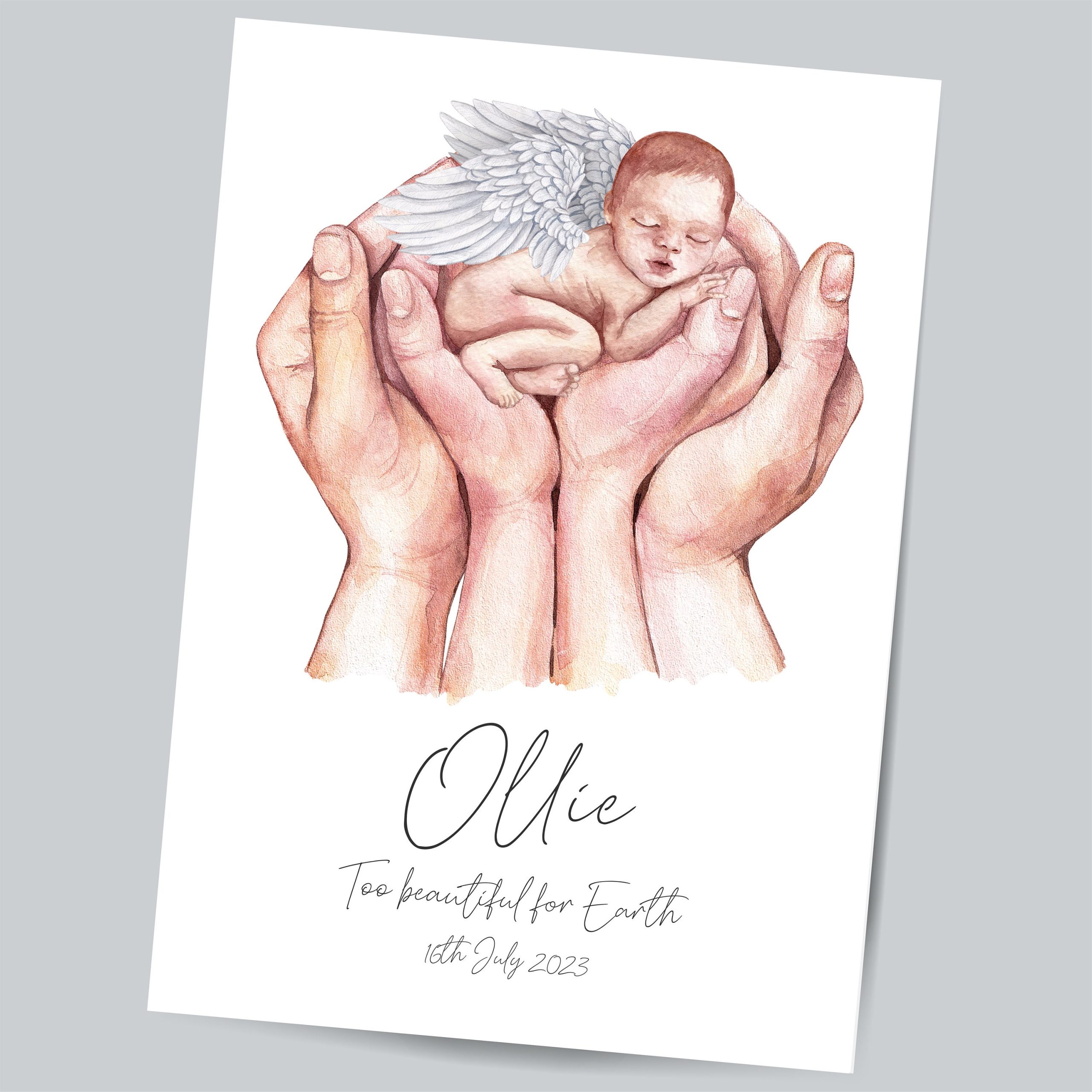 This beautiful watercolour illustration of tiny baby Angel sleeping peacefully in parents’ hands.