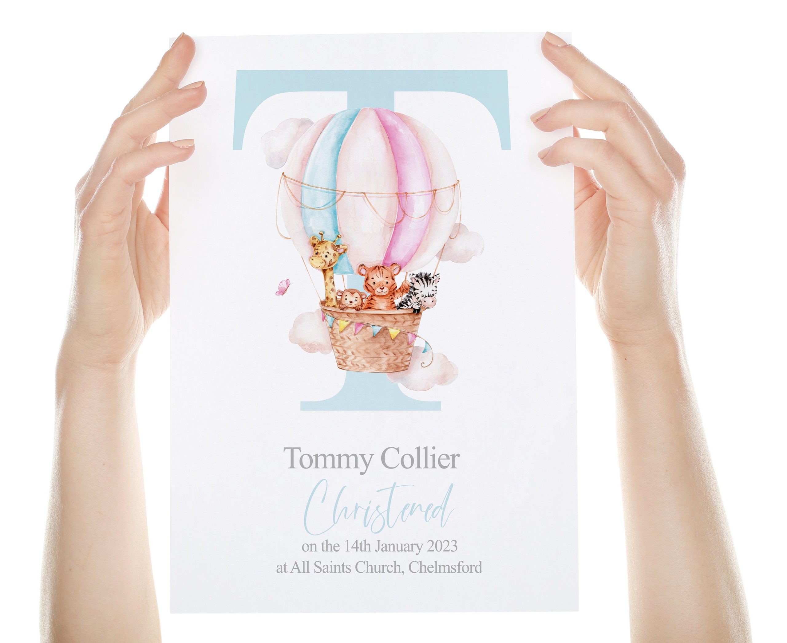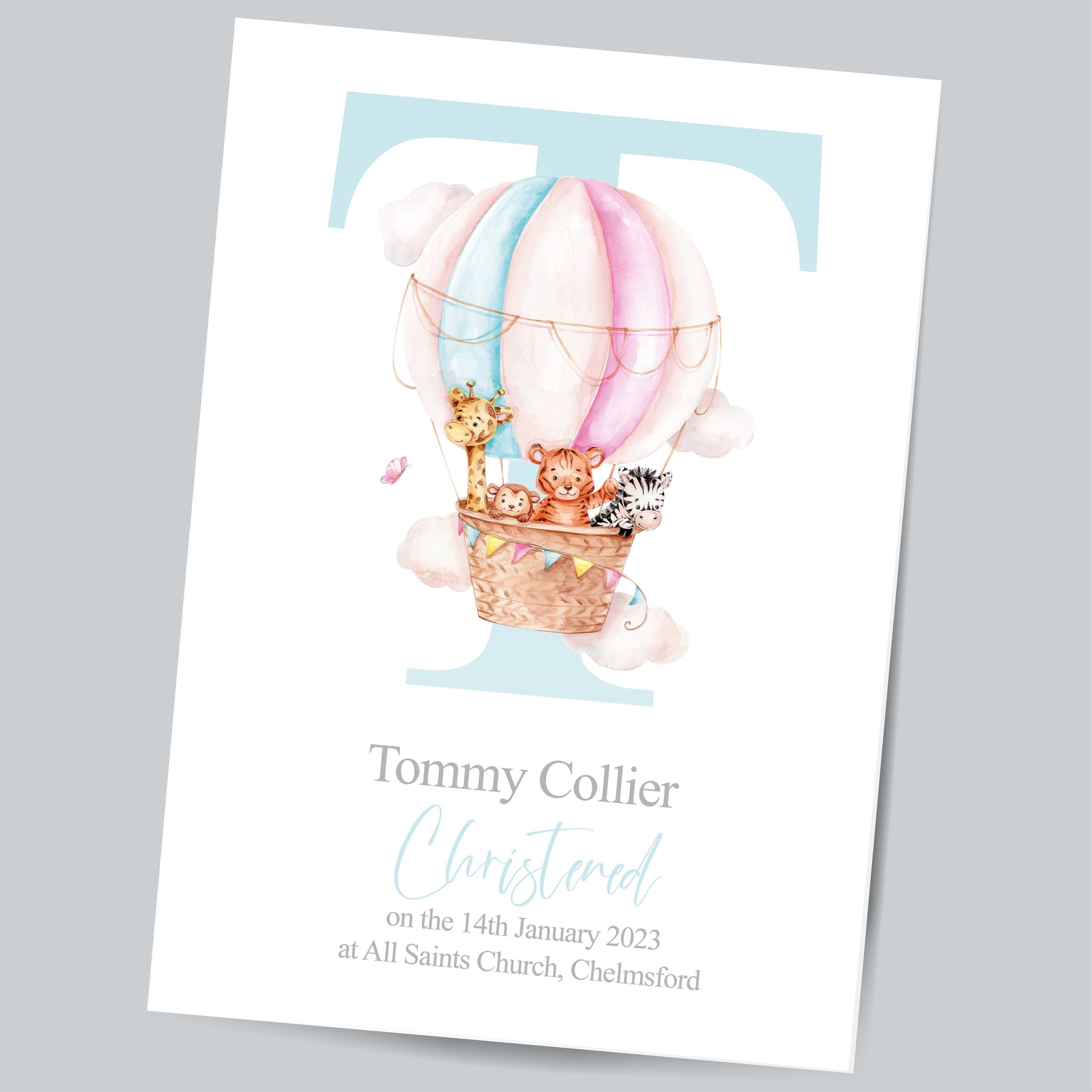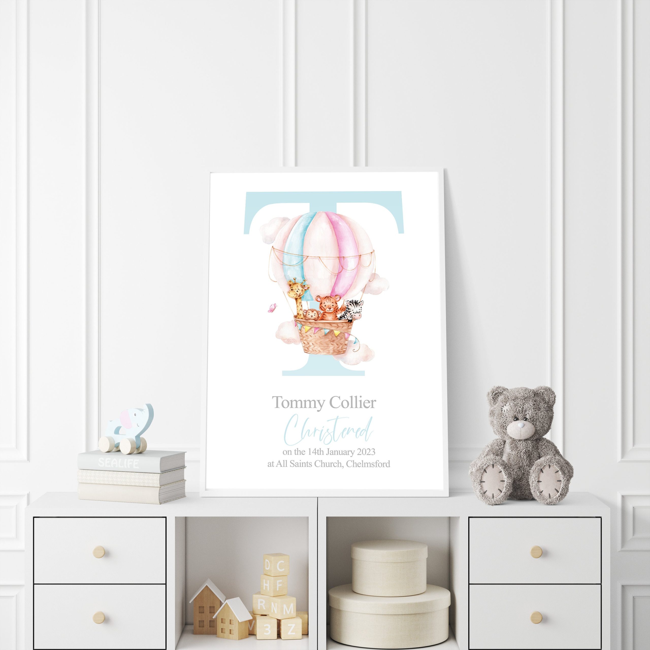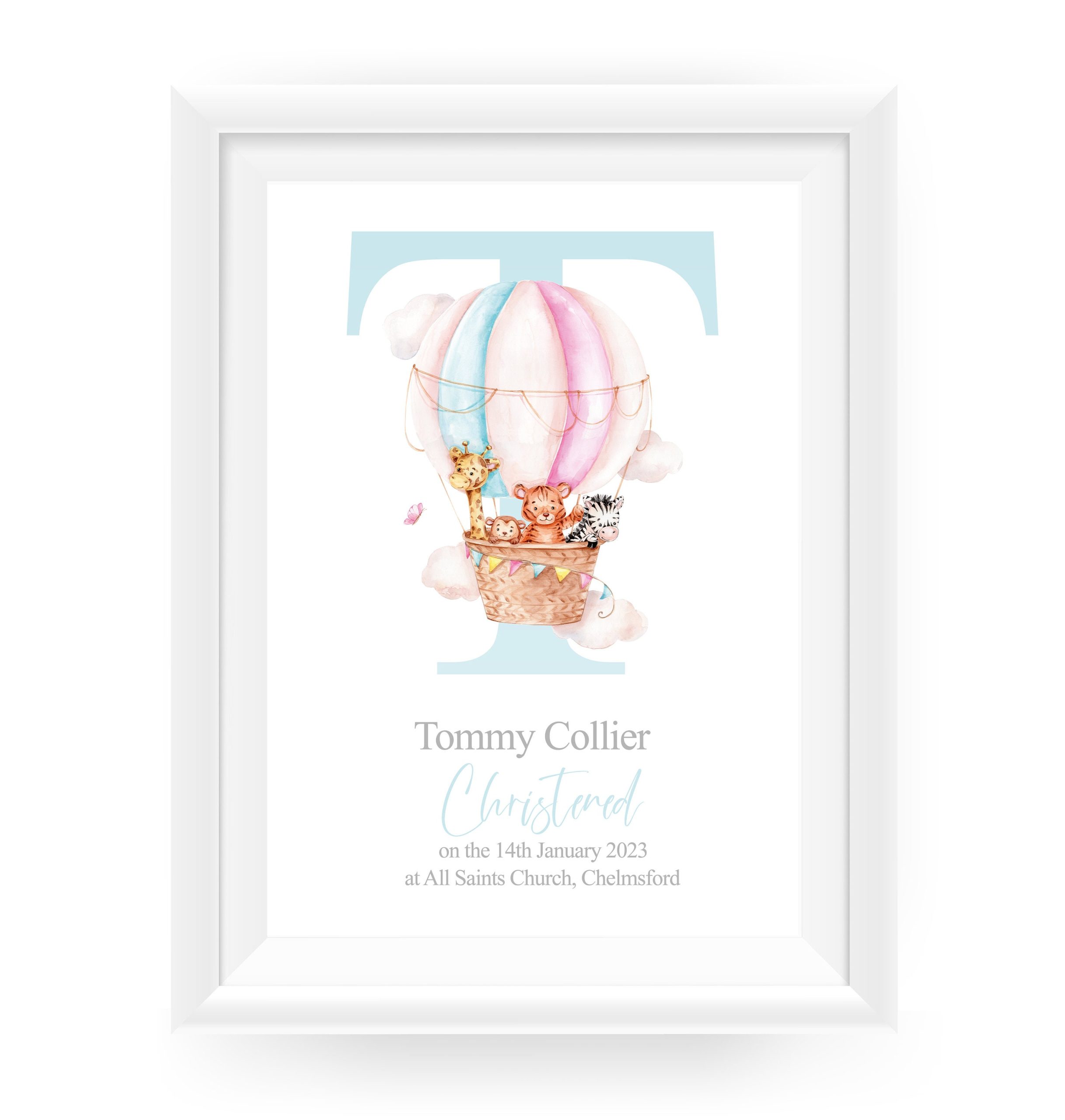 This adorable Personalised Baptism Gift Print for Baby Boy features a cute watercolour illustration of a Hot Air Balloon, a large blue Initial; Safari Animal Friends; little one’s name; location and date, (if you have something else in mind please pop a message through to me). This beautiful detailed print can also be adapted for Baptism, Naming Ceremony or Dedication. A One-of-a-kind meaningful Christening keepsake for baby Boy on his special day!