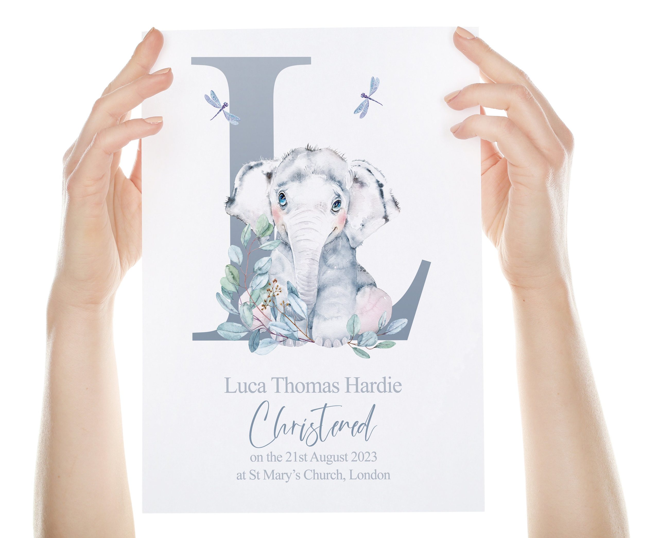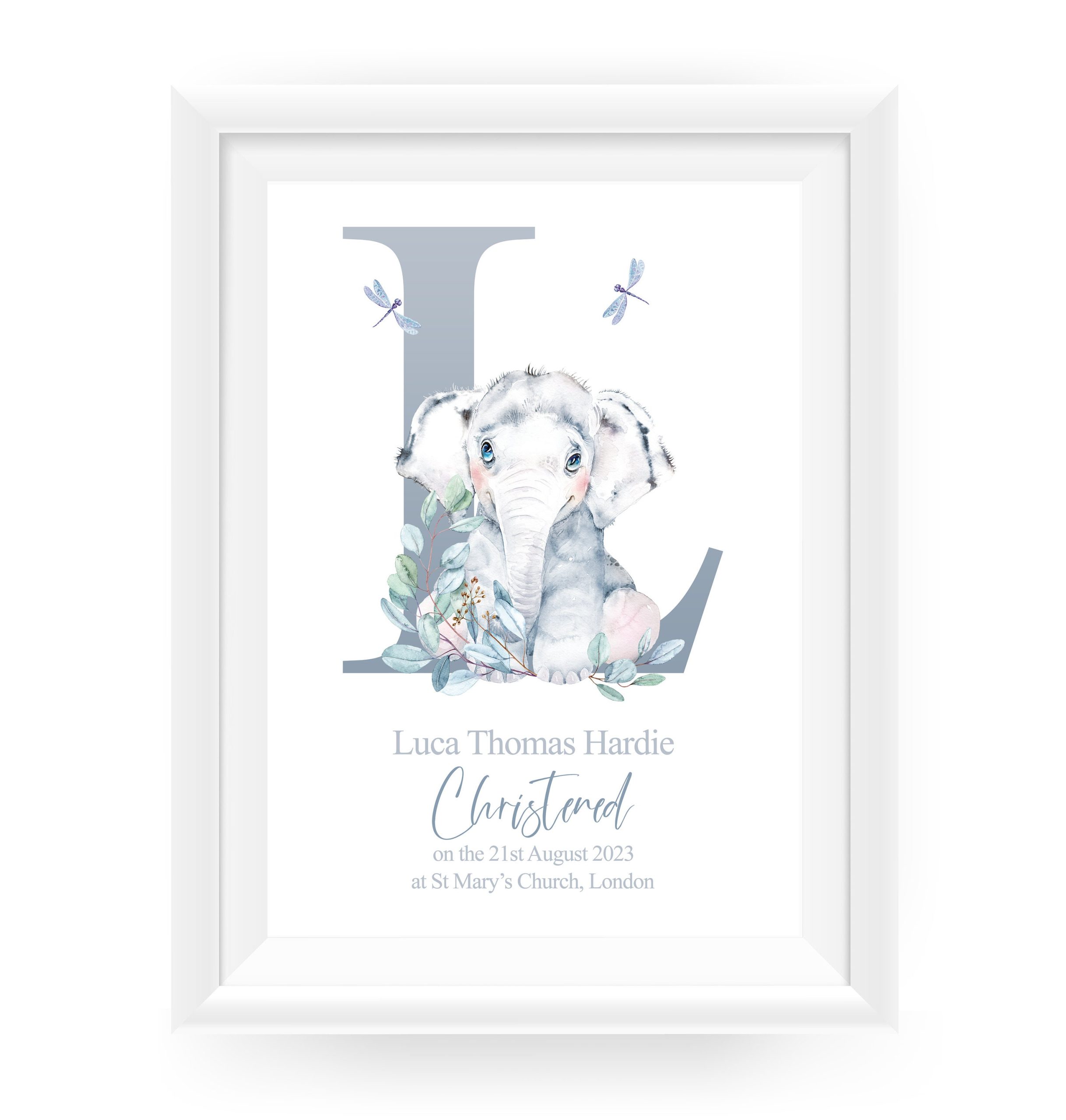 This adorable Personalised Christening Print for Boy’s features a cute watercolour illustration of a Baby Elephant, a large grey Initial; Dragonflies; little Name; location and date, (if you have something else in mind please pop a message through to me). This beautiful detailed print can also be adapted for Baptism, Naming Ceremony or Dedication. A One-of-a-kind meaningful Christening keepsake for Boy’s on his special day!