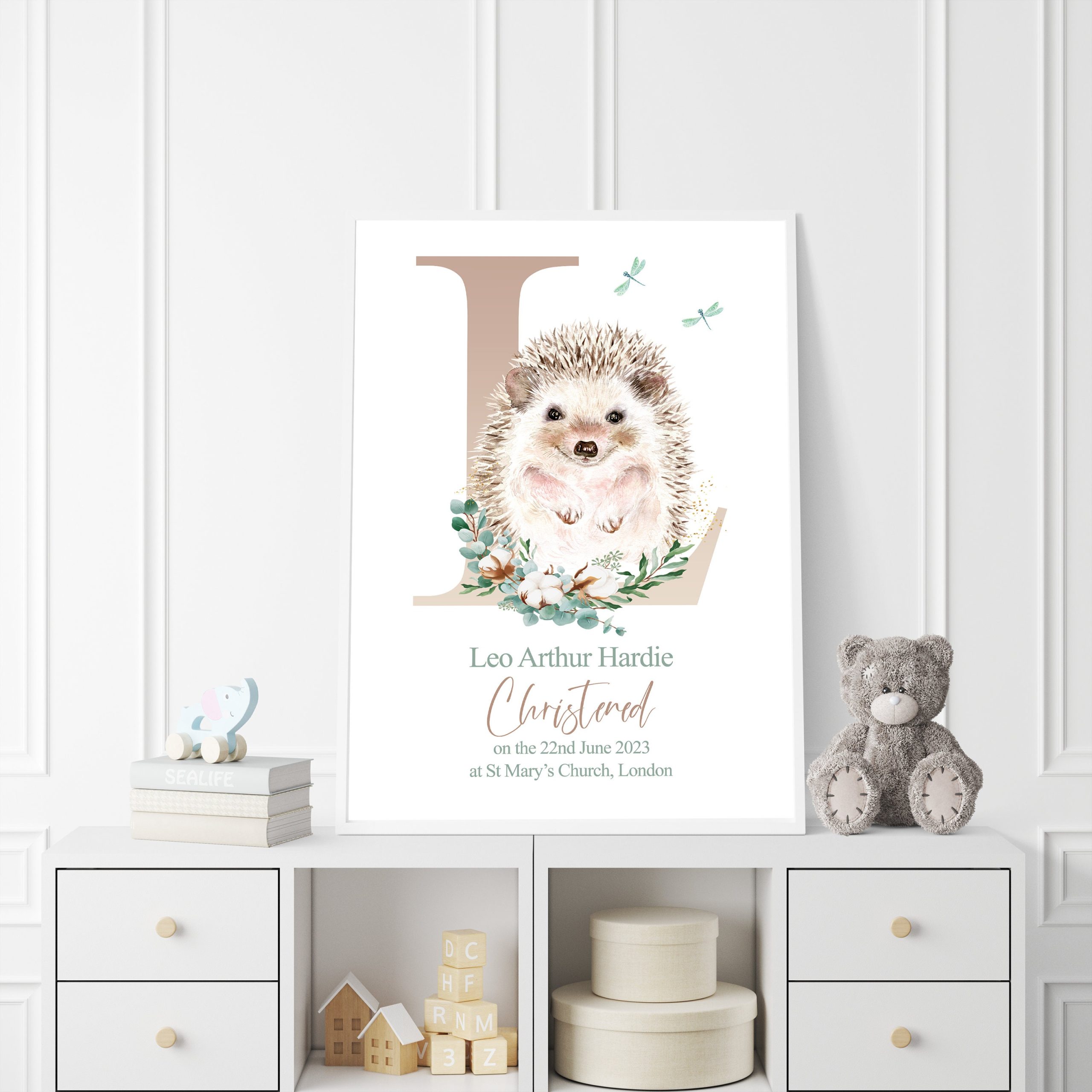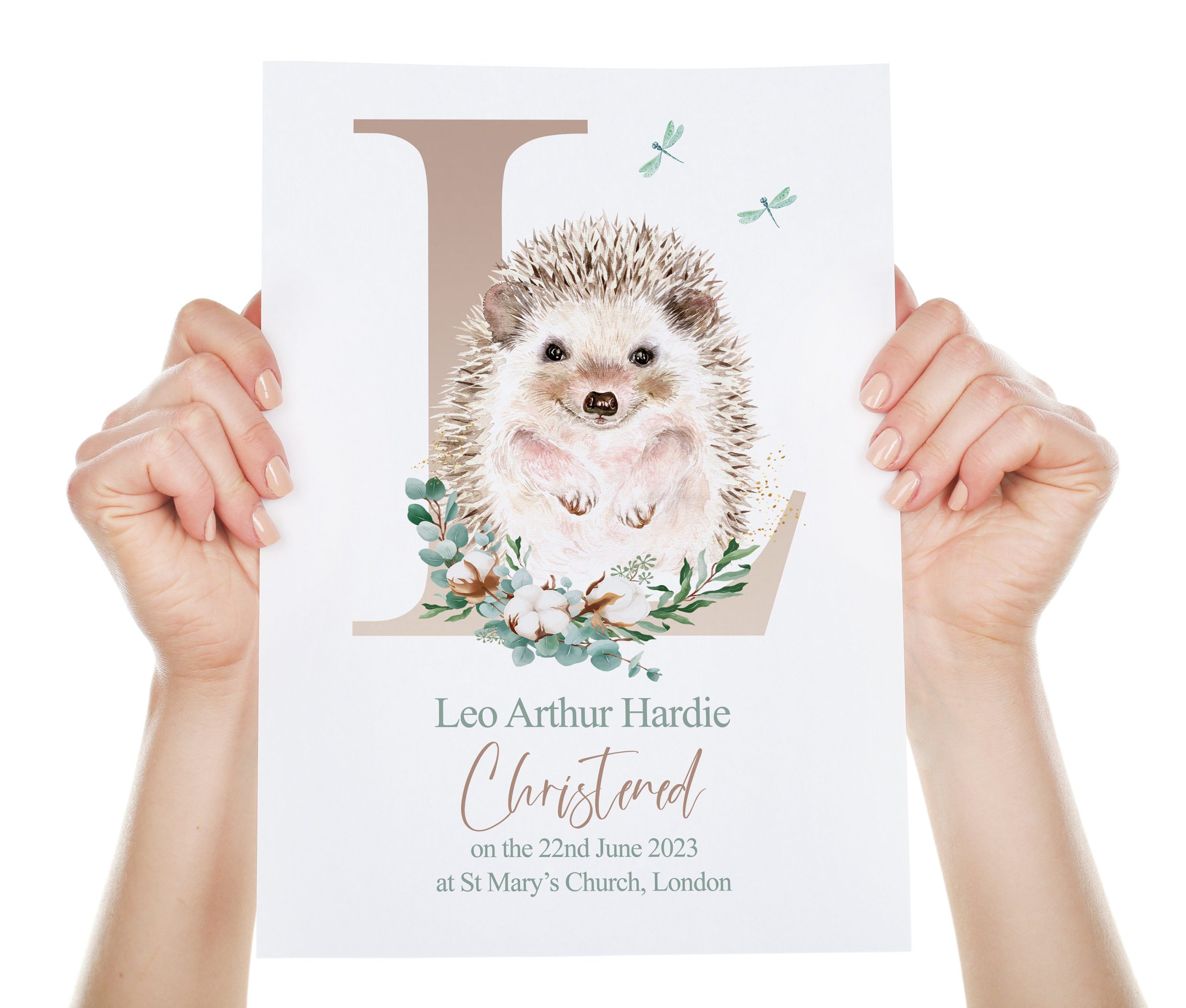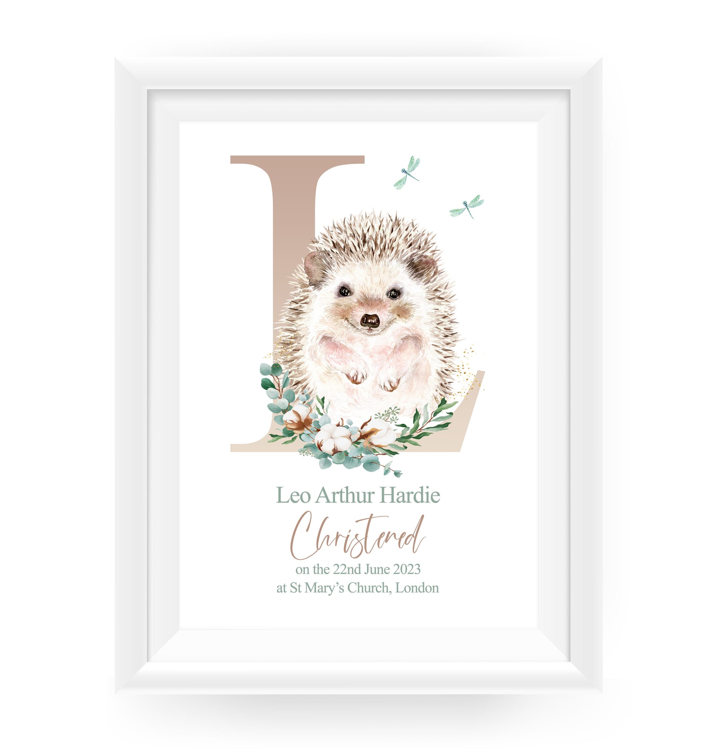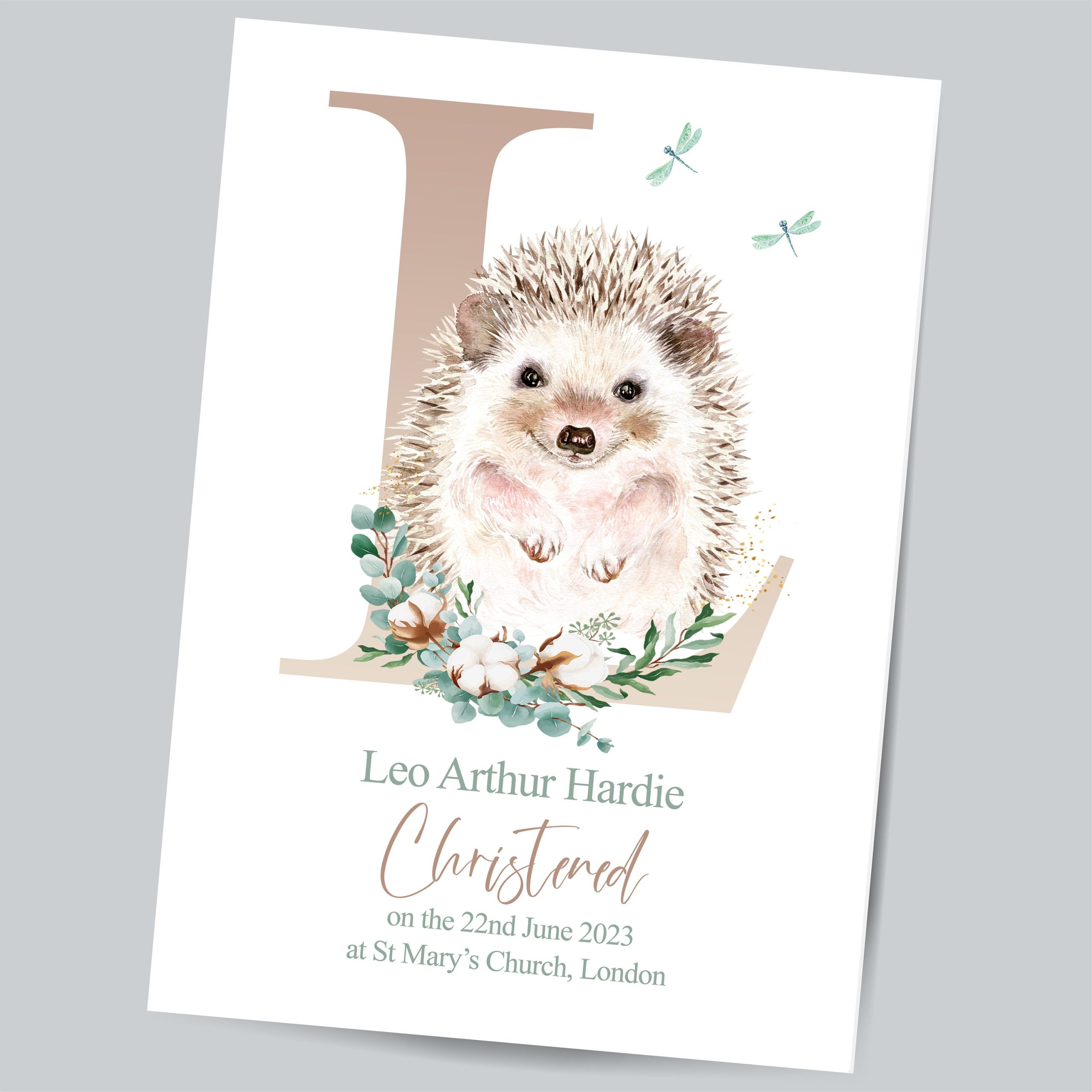 This adorable Personalised Christening Print for Boy features a cute watercolour illustration of a cute Hedgehog, a large Initial; Cotton Foliage; Dragonflies; little one’s name; location and date, (if you have something else in mind please pop a message through to me). This beautiful detailed print can also be adapted for Baptism, Naming Ceremony or Dedication. A One-of-a-kind meaningful Christening keepsake for baby Boy on his special day!