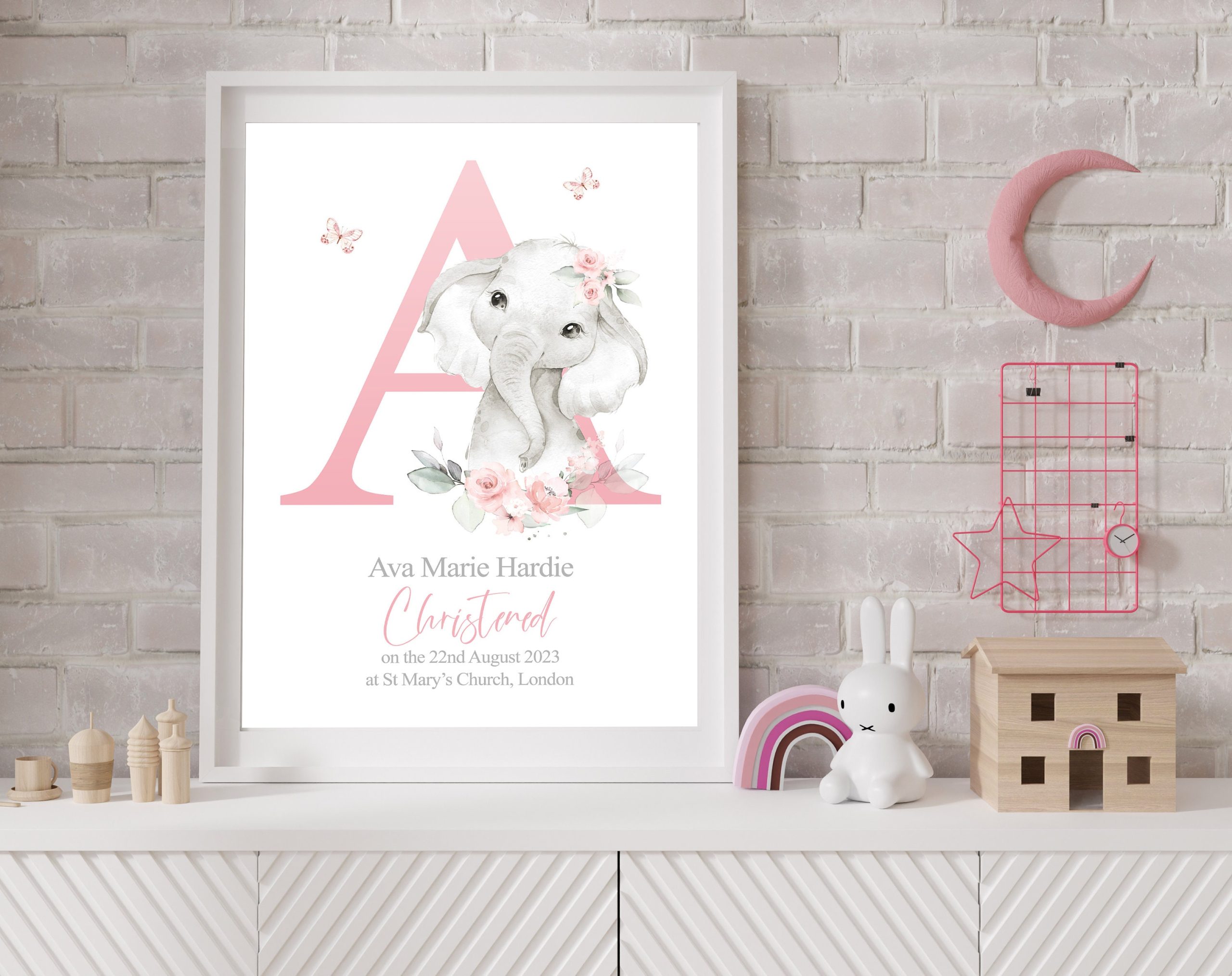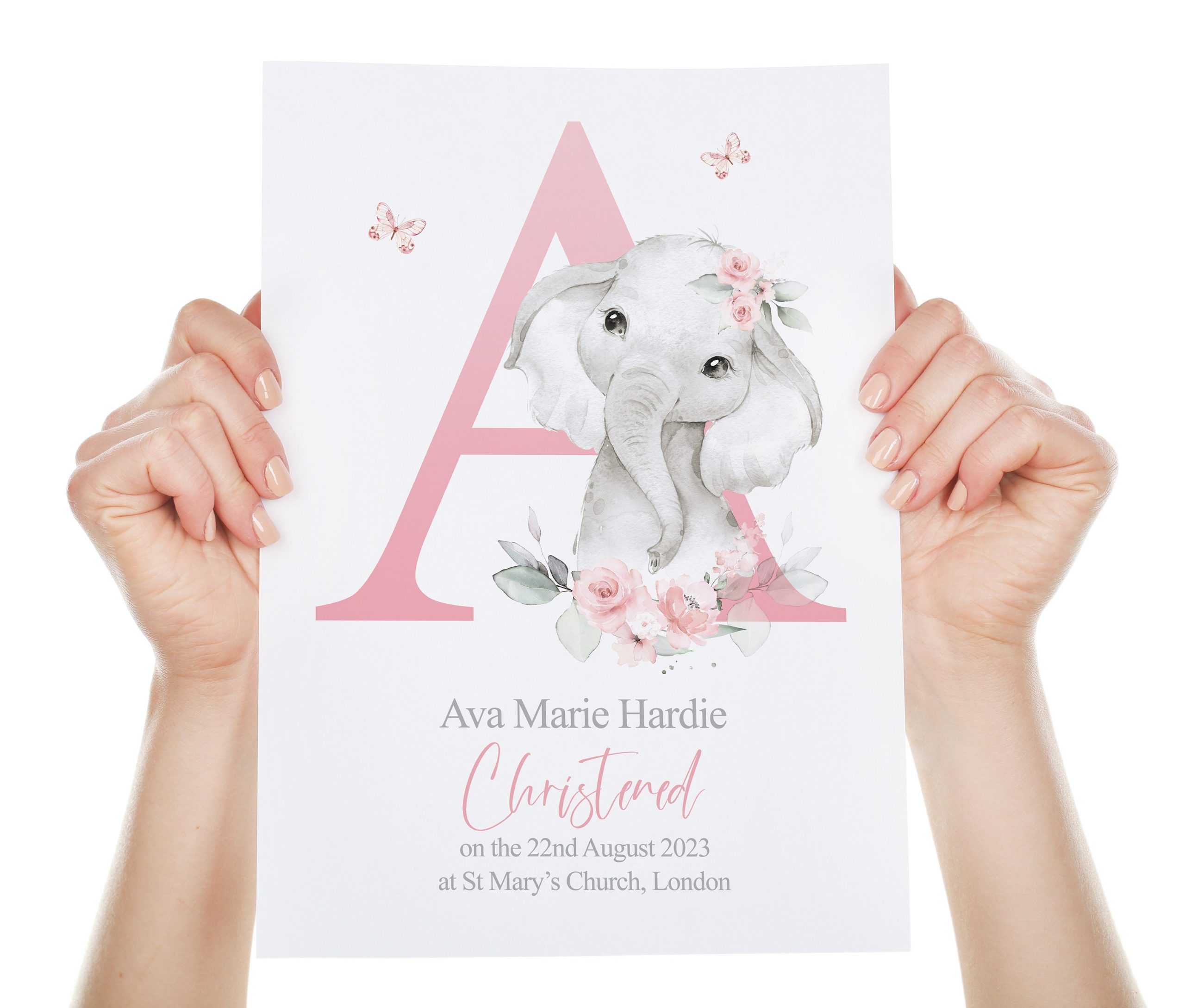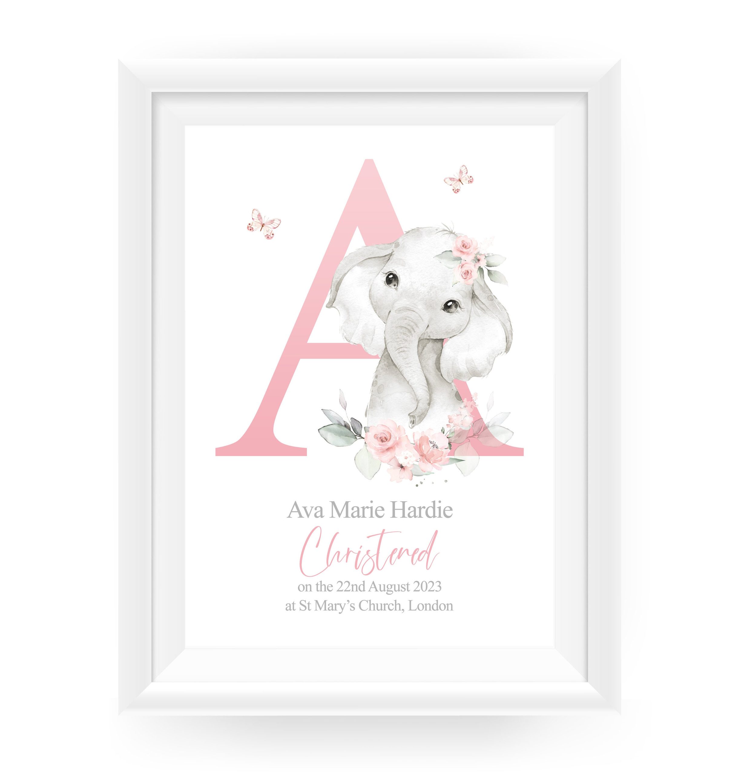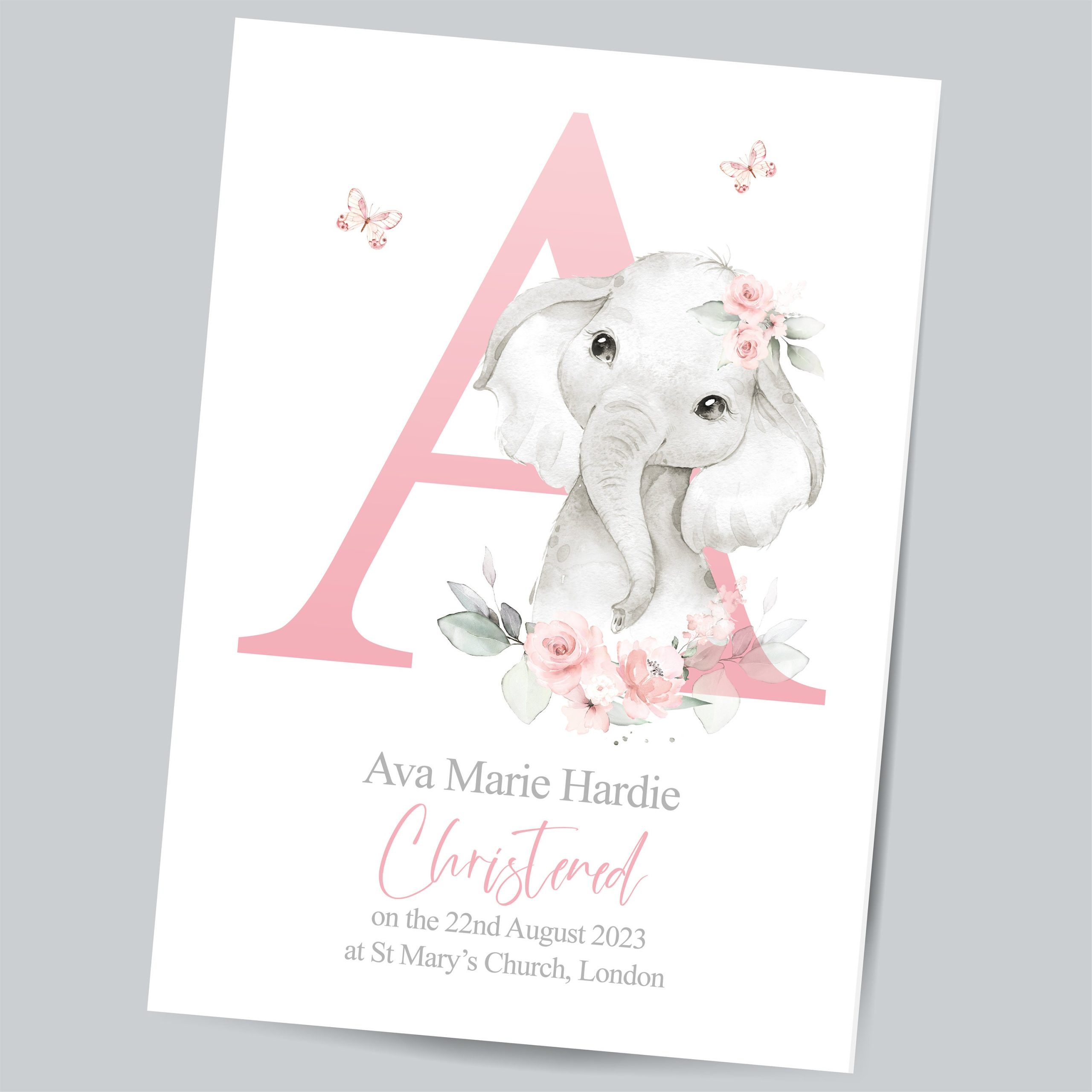 This adorable Personalised Christening Print for Girl features a cute watercolour illustration of a Baby Elephant, a large pink Initial; butterflies; little one’s name; location and date, (if you have something else in mind please pop a message through to me). This beautiful detailed print can also be adapted for Baptism, Naming Ceremony or Dedication. A One-of-a-kind meaningful Christening keepsake for baby girl on her special day!
