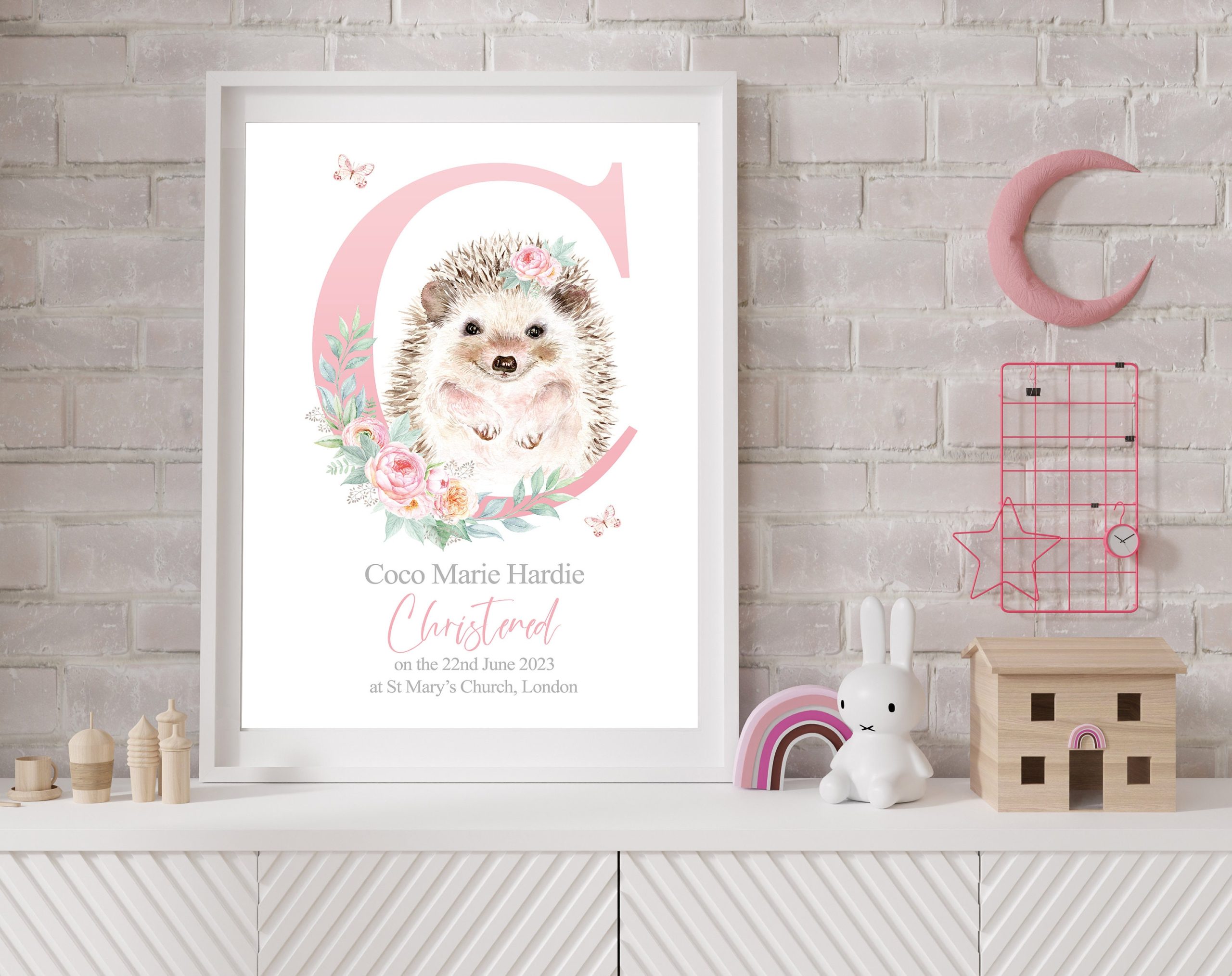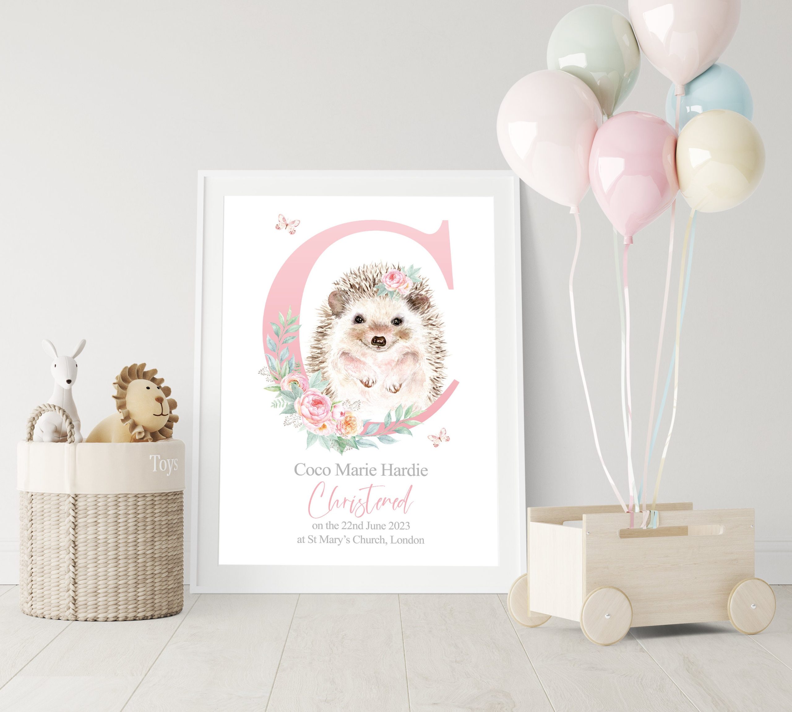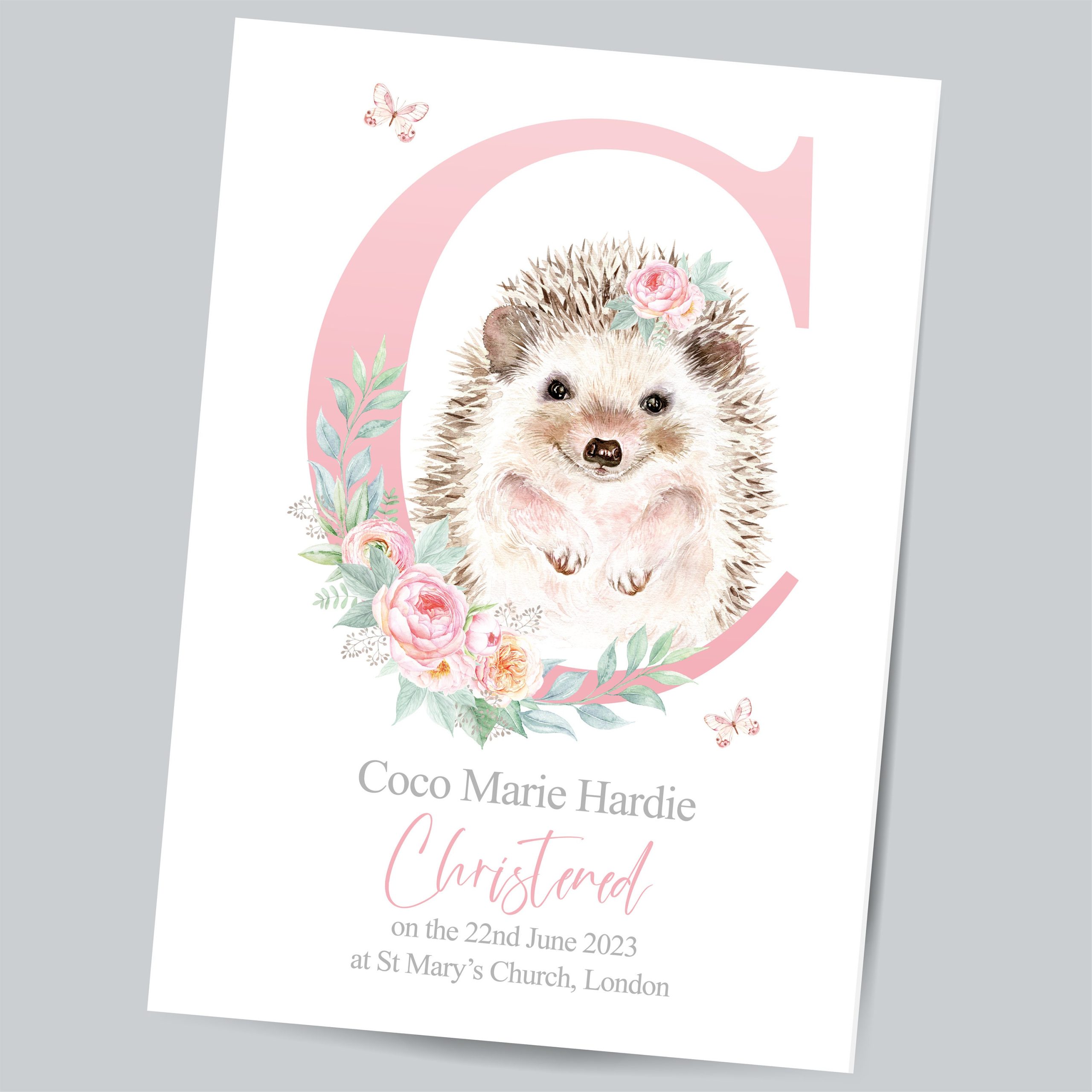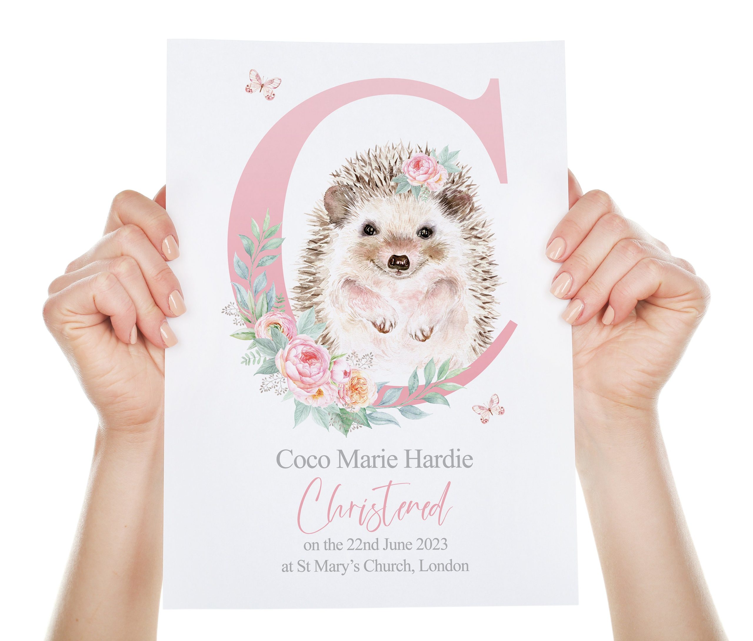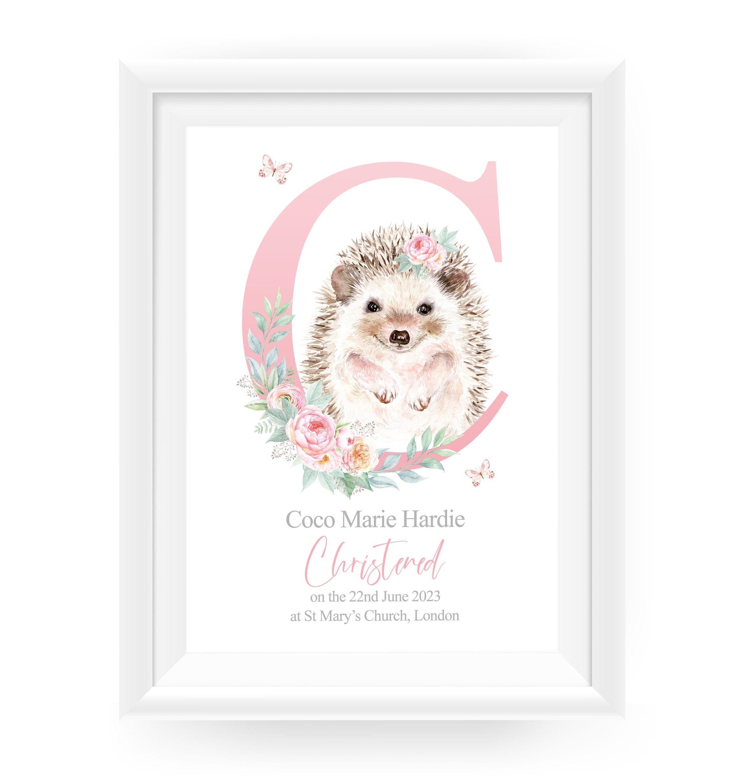 This adorable Personalised Christening Print for Girl features an adorable watercolour illustration of a Hedgehog, a large pink Initial; butterflies; Florals; little one’s name; location and date, (if you have something else in mind please pop a message through to me). This beautiful detailed print can also be adapted for Baptism, Naming Ceremony or Dedication. A One-of-a-kind meaningful Christening keepsake for baby girl on her special day!