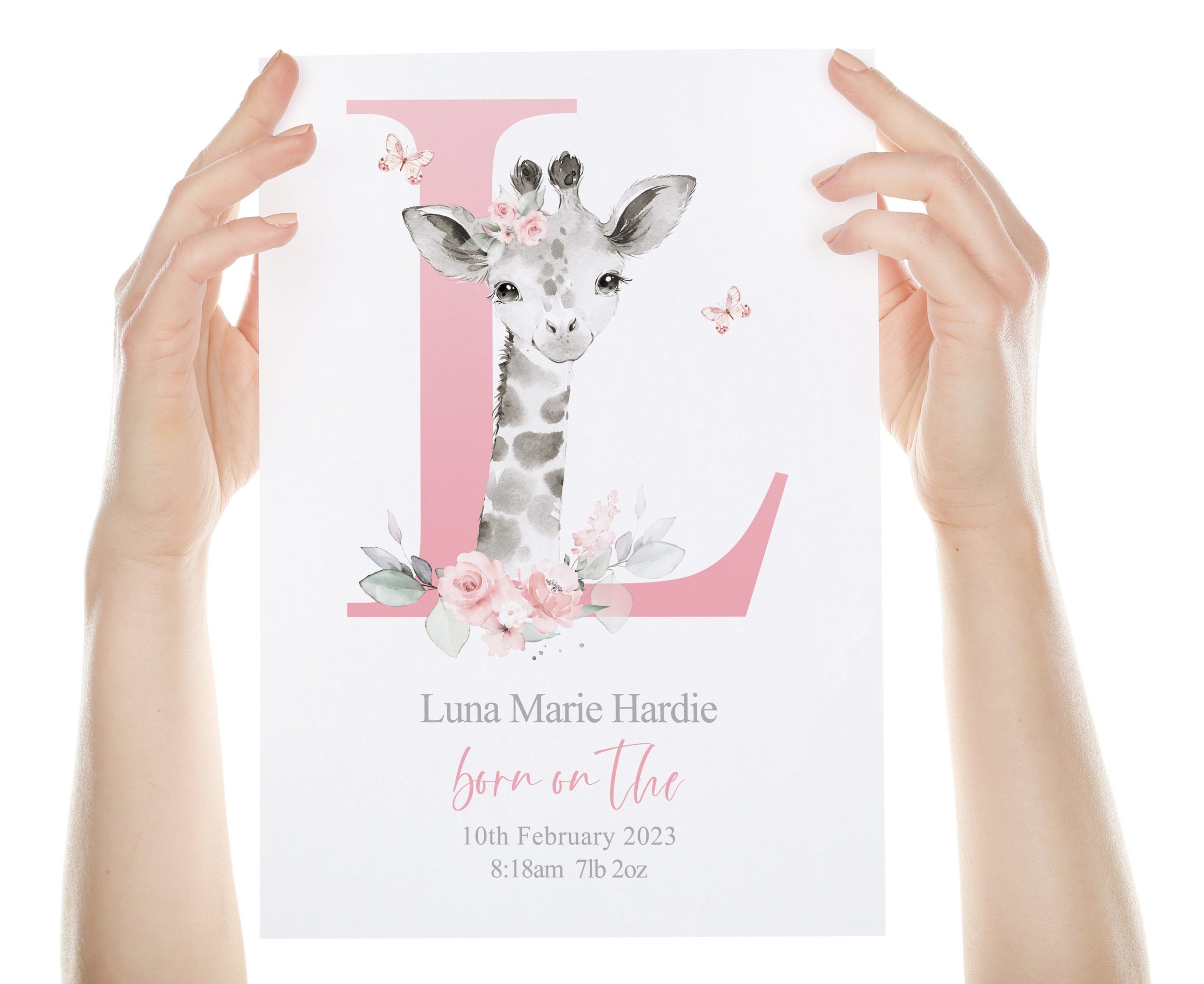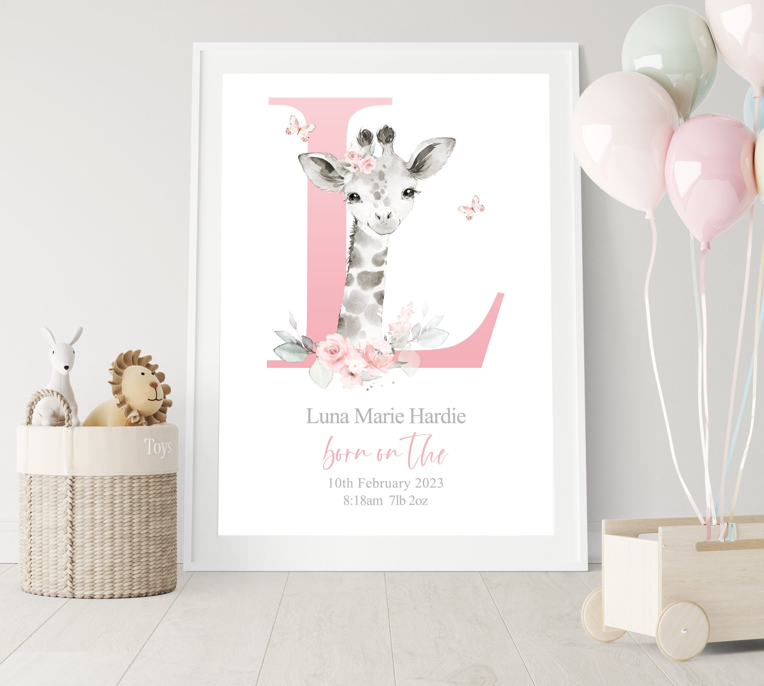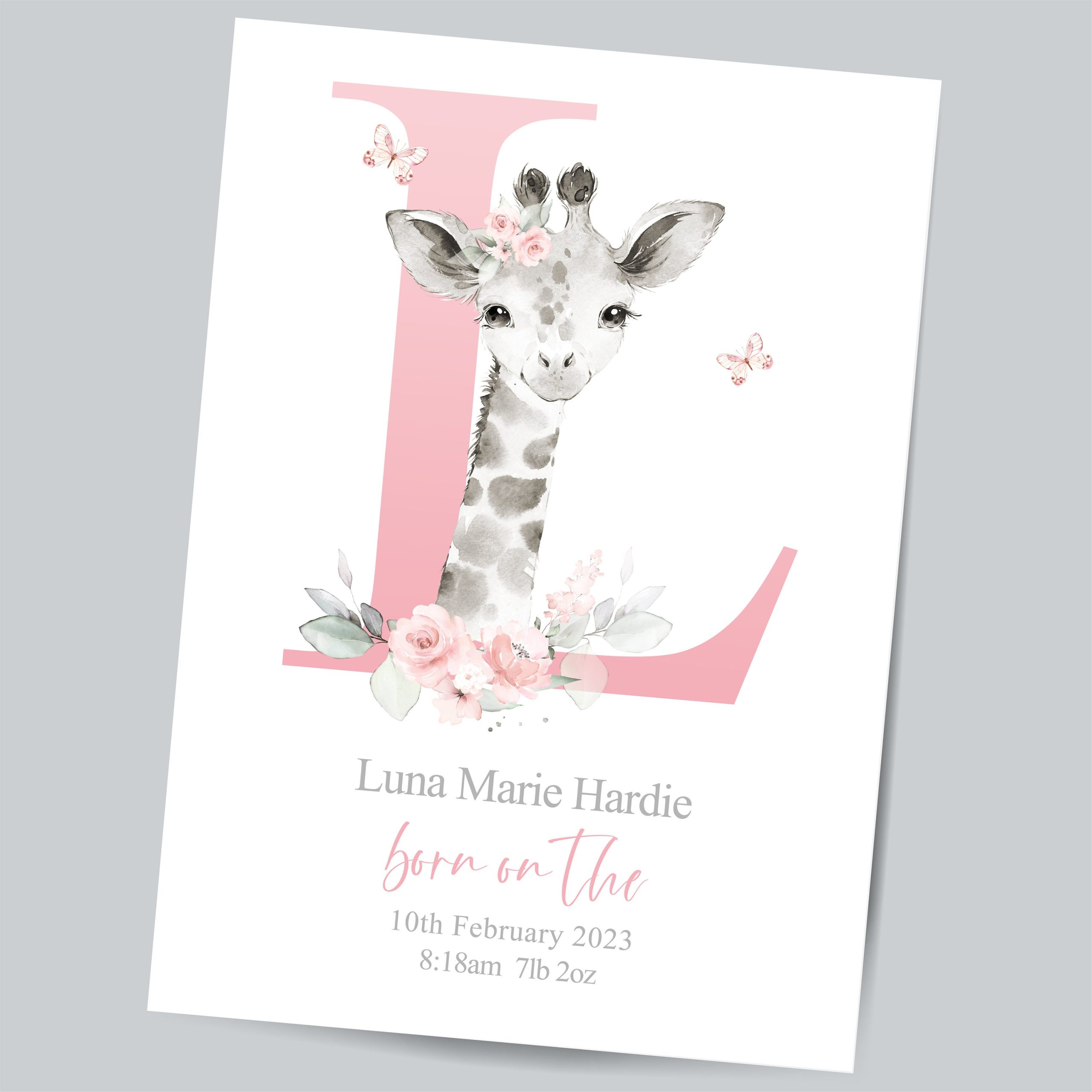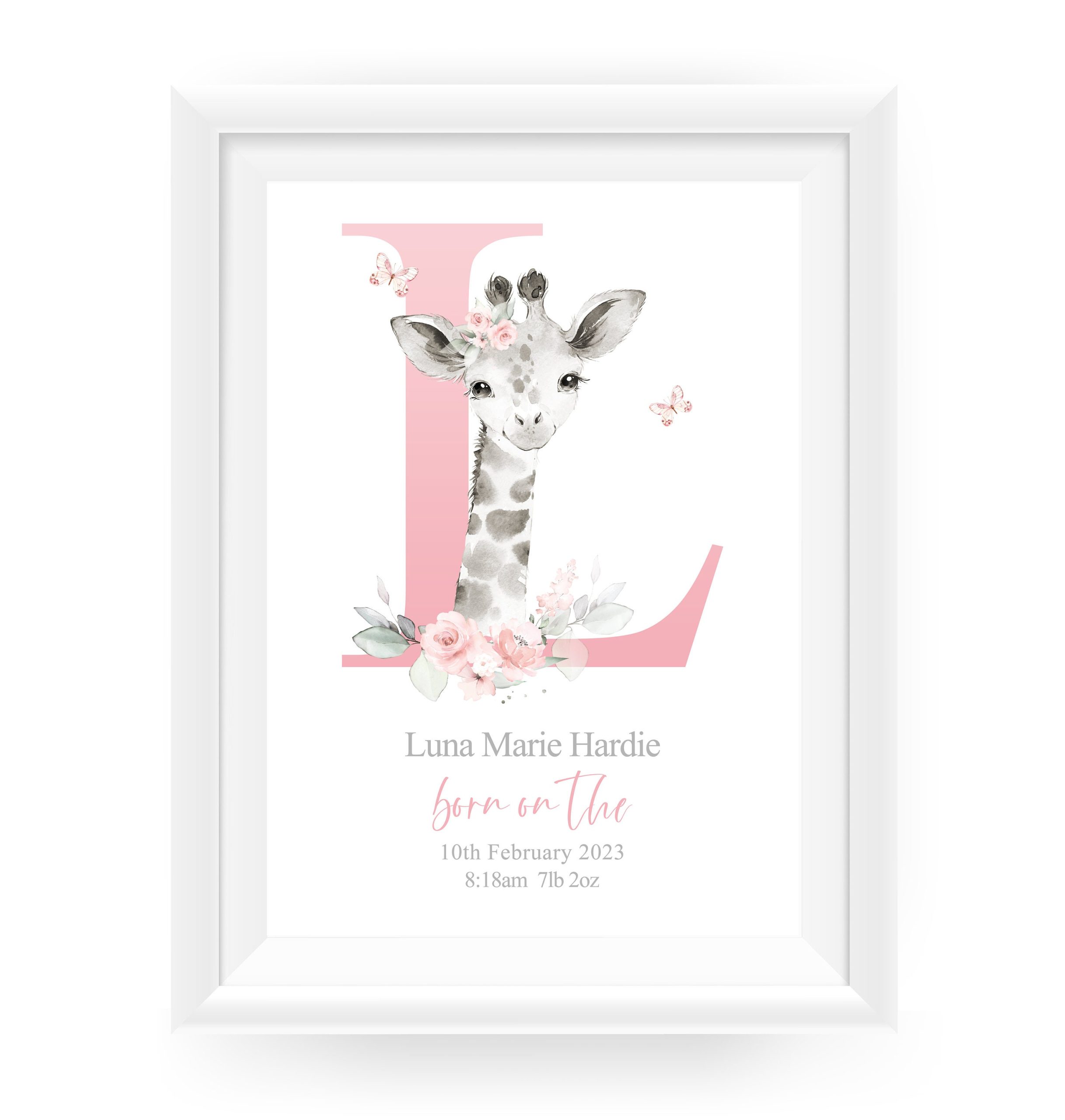 This adorable Personalised New Baby Girl Print features a cute watercolour illustration of a Baby Giraffe, a large pink Initial; butterflies; little one’s name and birth details, (if you have something else in mind please pop a message through to me). A One-of-a-kind meaningful keepsake for baby girl to celebrate entering the world!