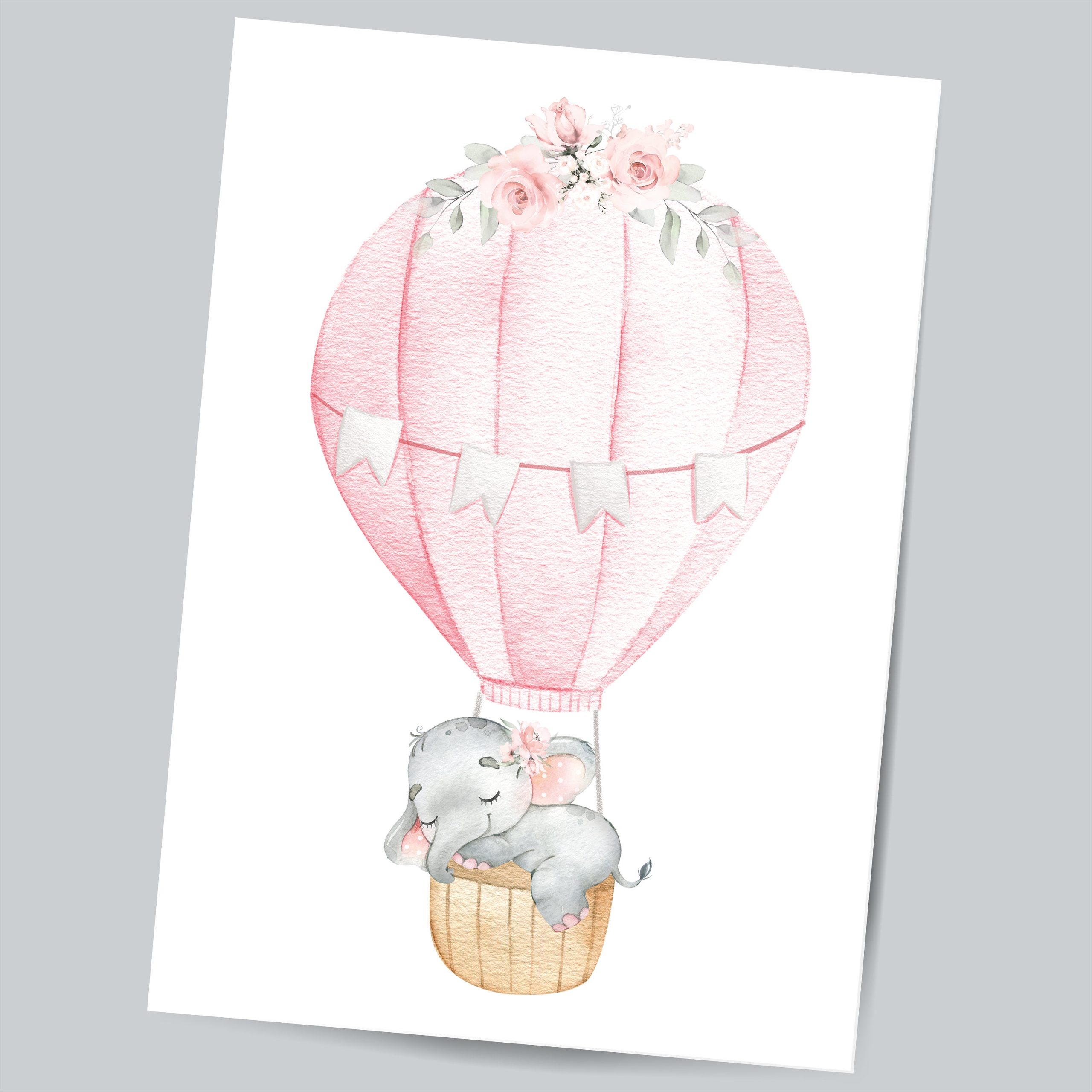 This Personalised Elephant print set features three prints with hand drawn illustrations of baby elephant sleeping on a fluffy cloud, Large initial with pink flowers & foliage, and Elephant going on an adventure in her Hot Air Balloon. The soft pink and grey shade of colours used to create these adorable traditional elephant nursery art prints makes this set a perfect choice for a baby girl’s nursery, toddlers bedroom or playroom.