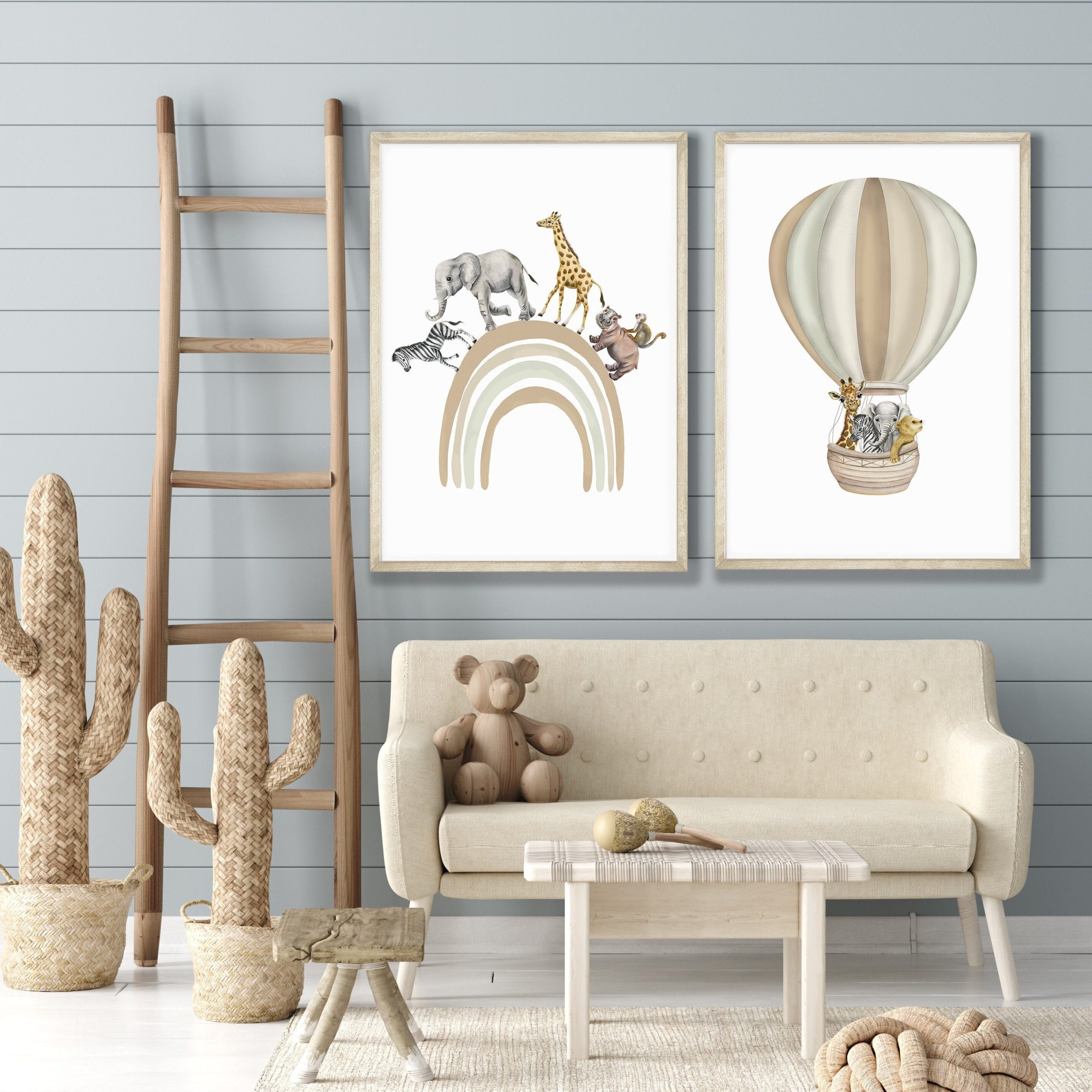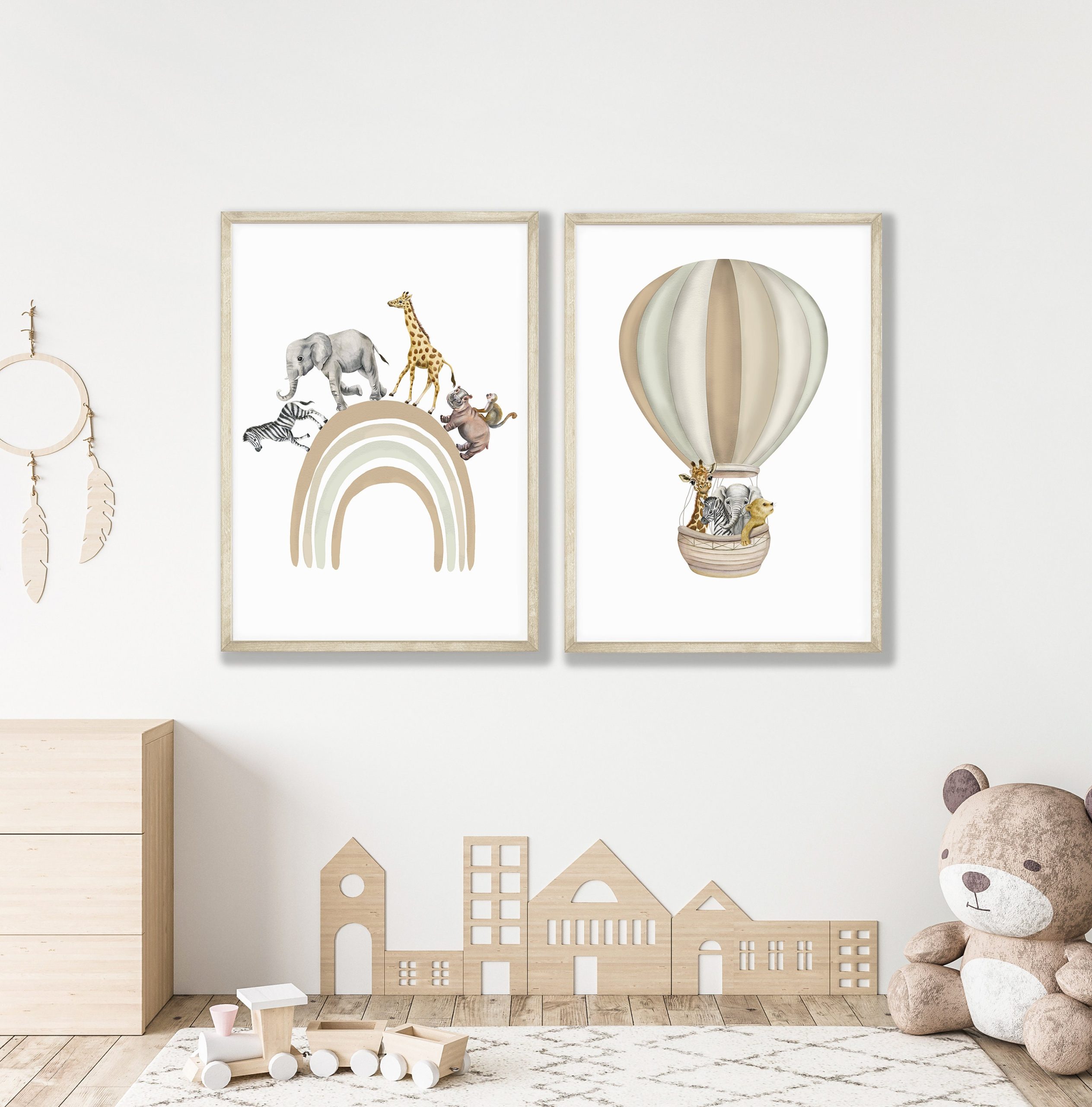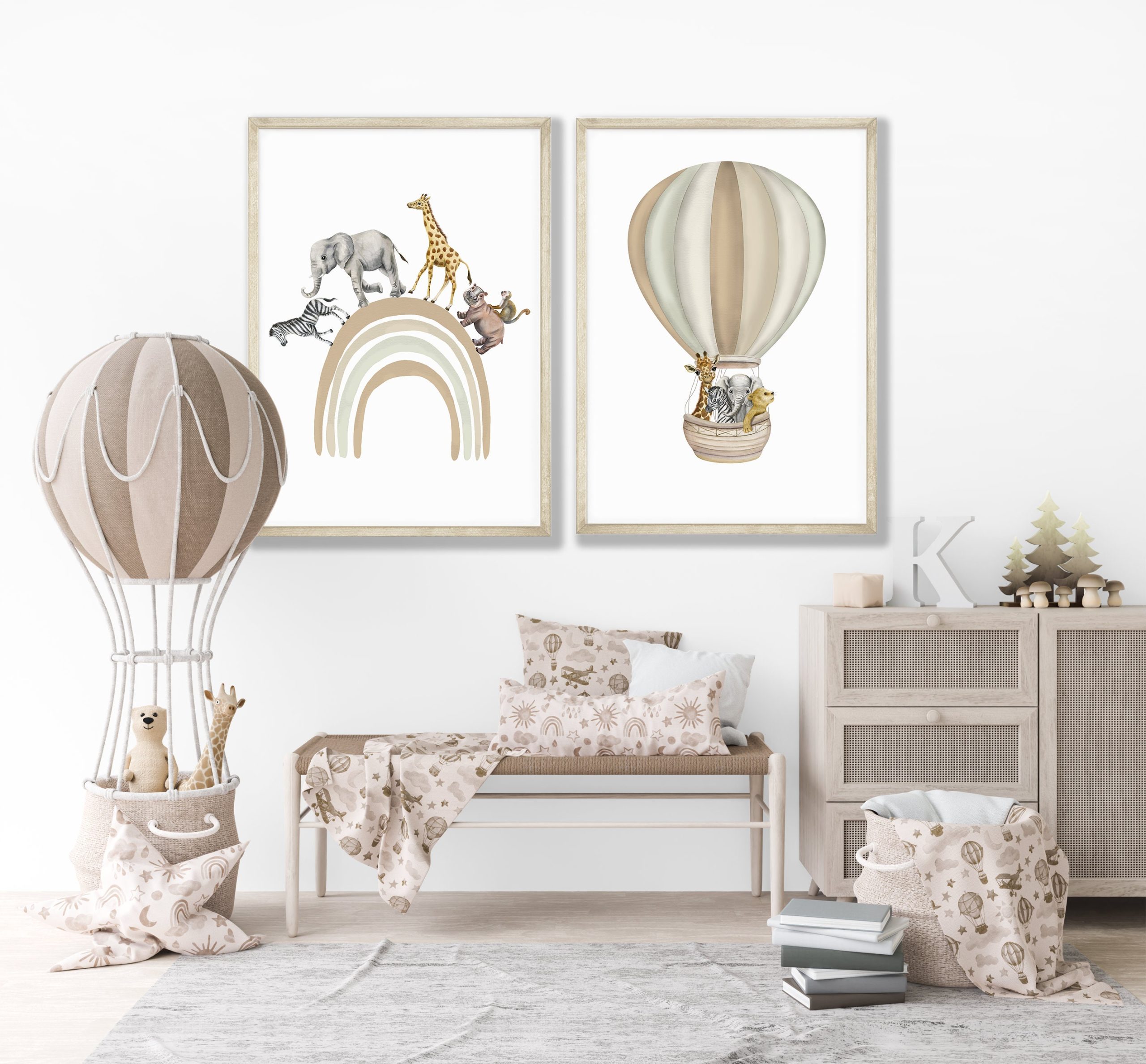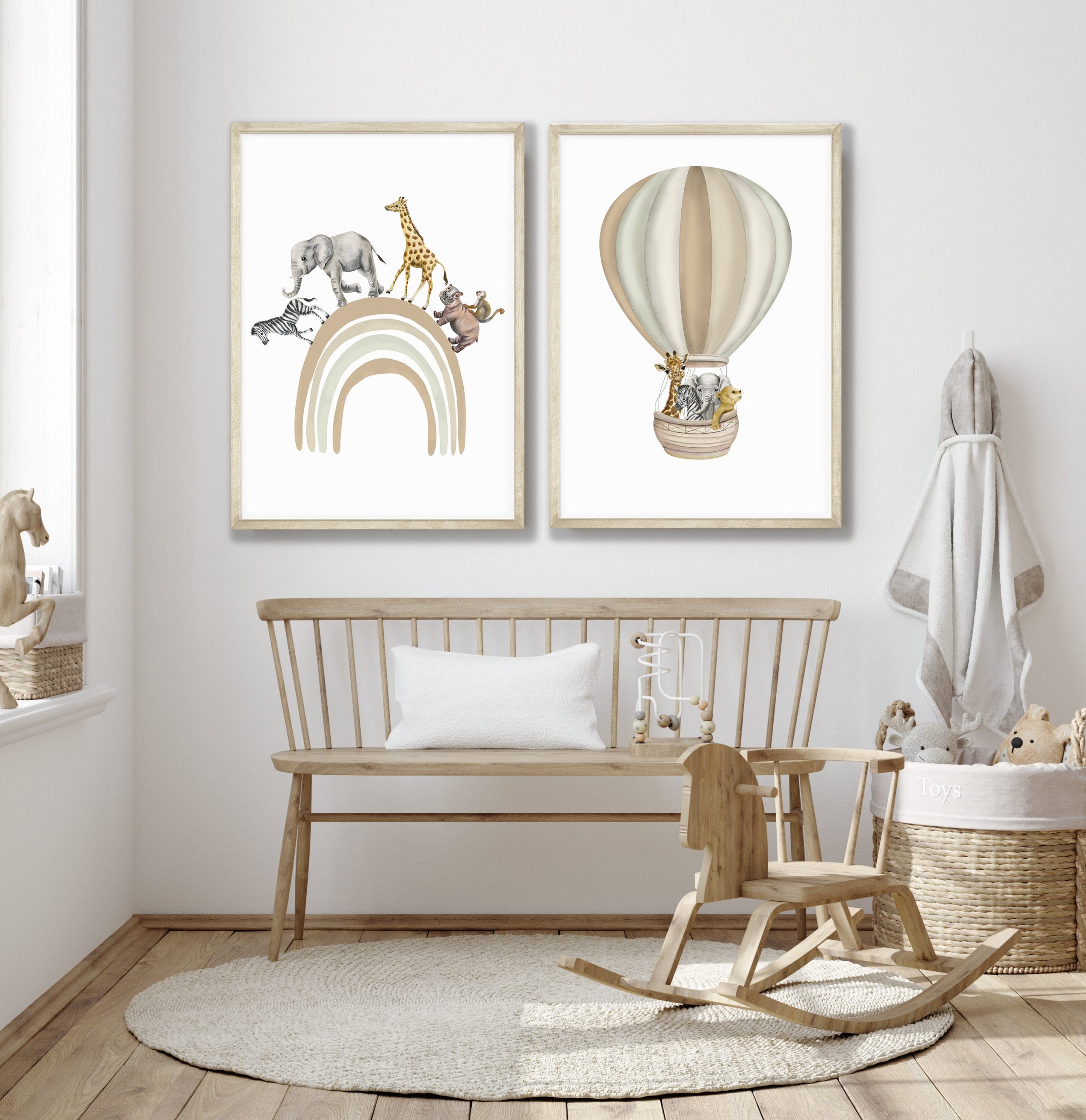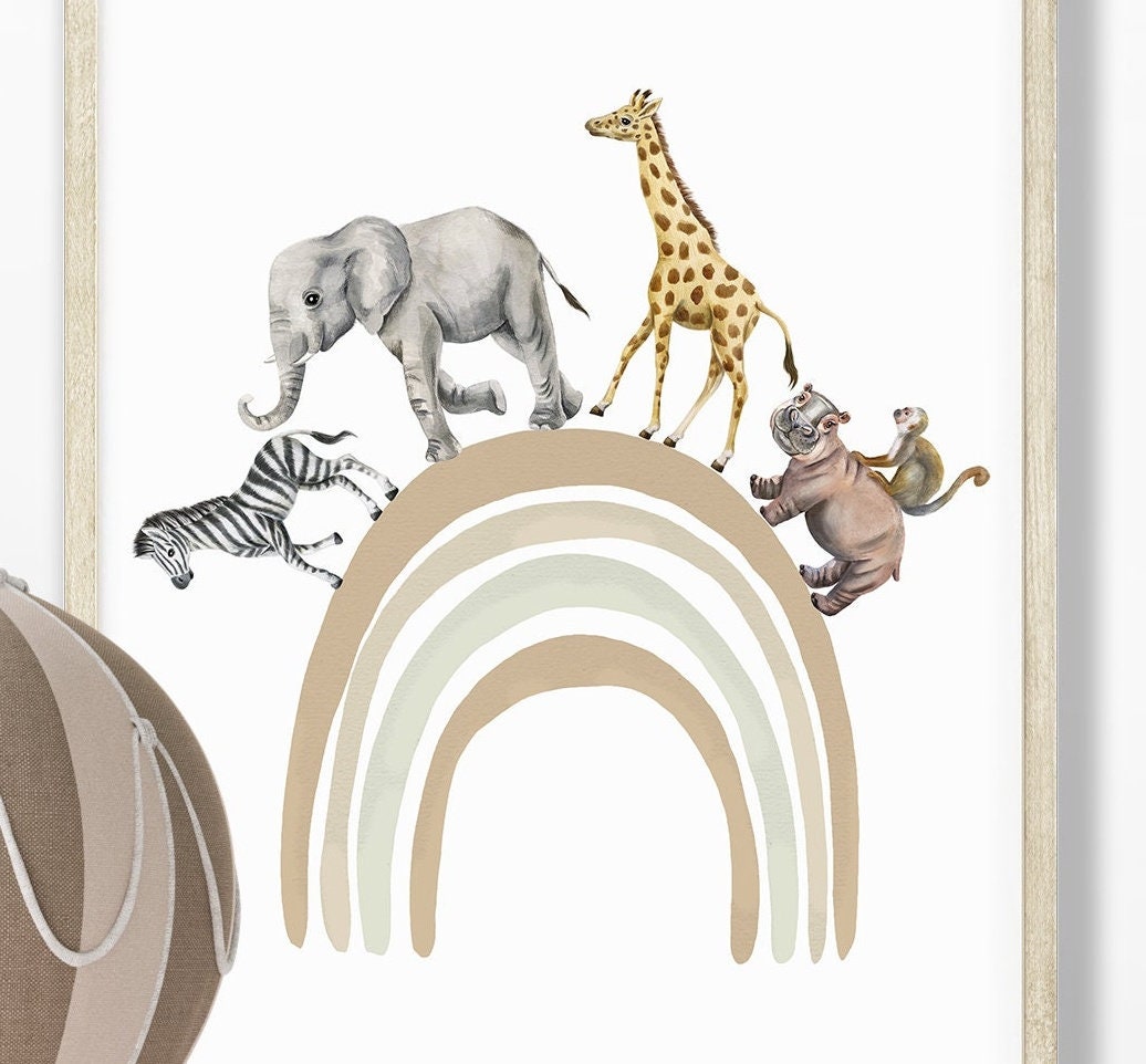 These safari animal Hand Drawn watercolour print set of two features illustrations of fun safari animals, zerba; lion; elephant and giraffe going on an adventure in a beige hot air balloon. A netural coloured rainbow with safari friends zebra; elephant; giraffe; hippo and cheeky money going on a rainbow walk. The neutral shade of colours used to create these fun nursery prints makes this set a perfect choice for baby boy’s nursery, Girl’s Nursery, toddlers bedroom or playroom. The rainbow and hot air balloon colours are customisable… If you would like alternative colours, please reach out and will be happy to accommodate.
