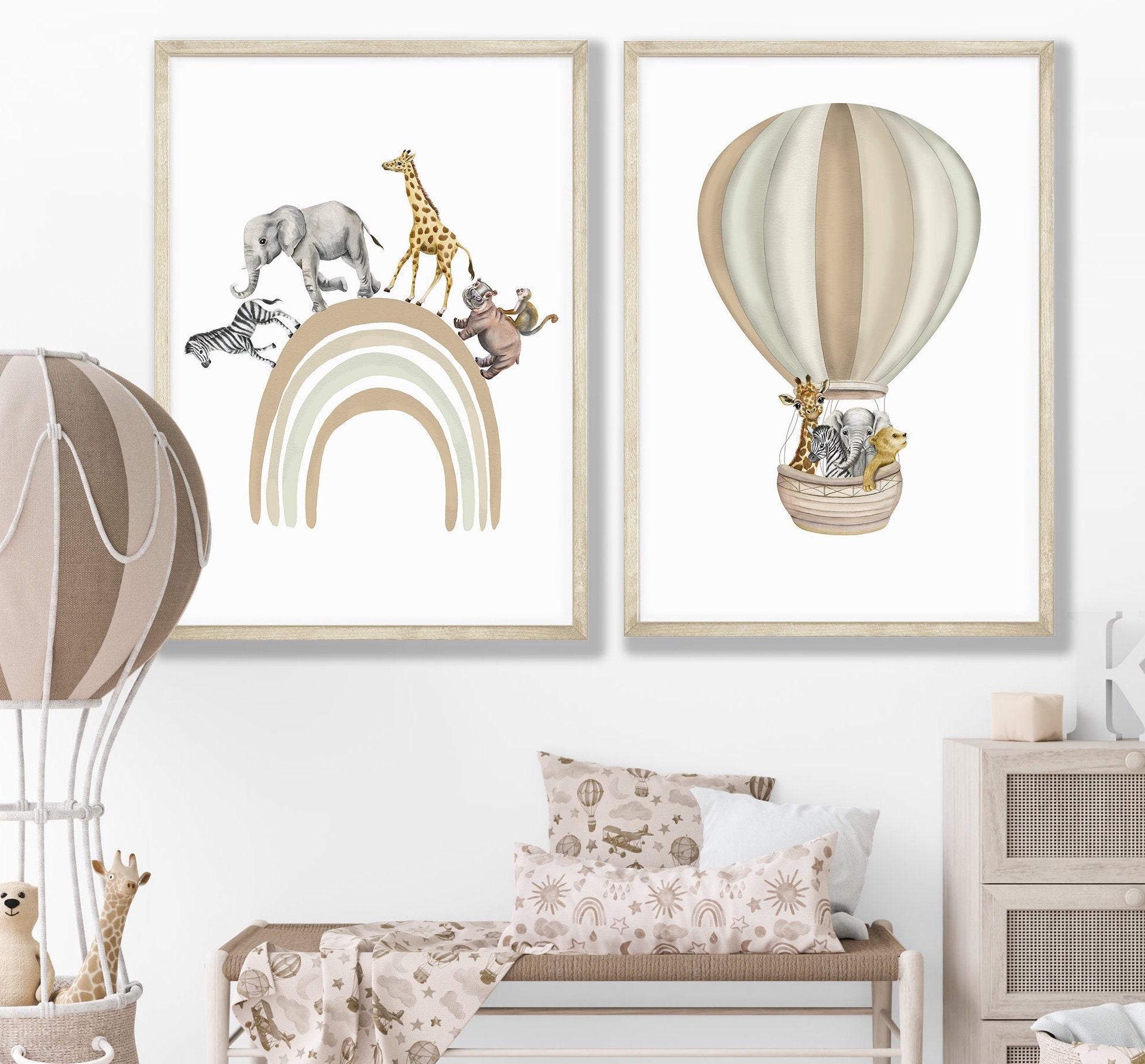 Adorable and Full of Character Set of two hot air balloon and rainbow safari animal prints.