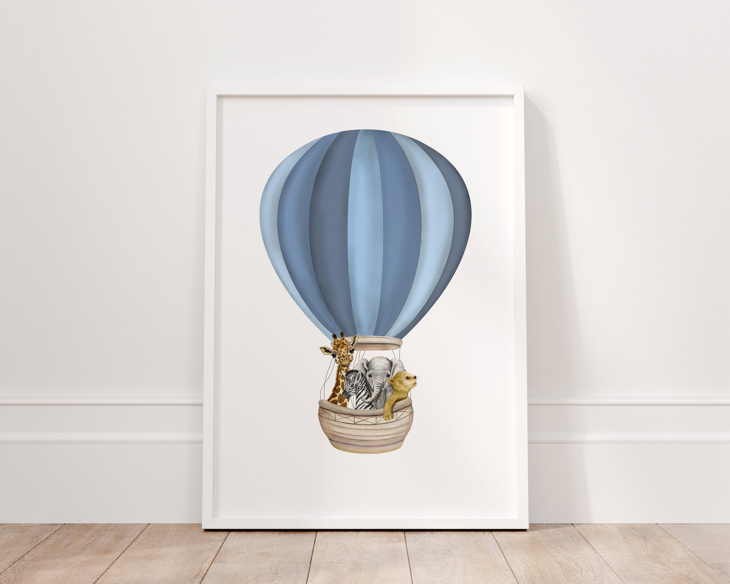 Blue Rainbow Safari Nursery Prints – Hot Air Balloon Art with Safari Animals