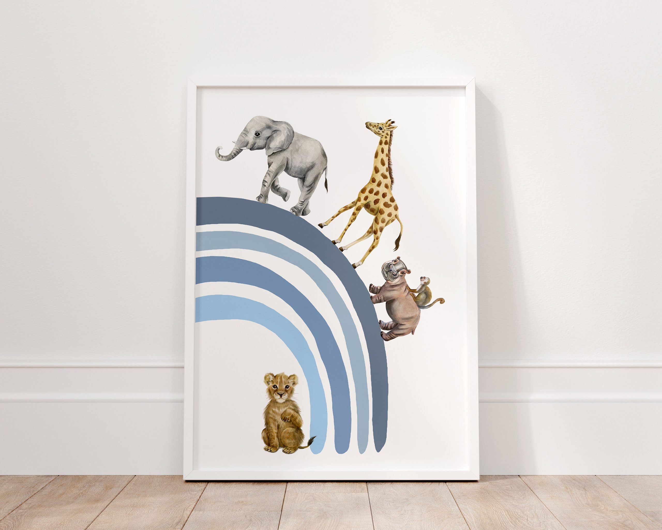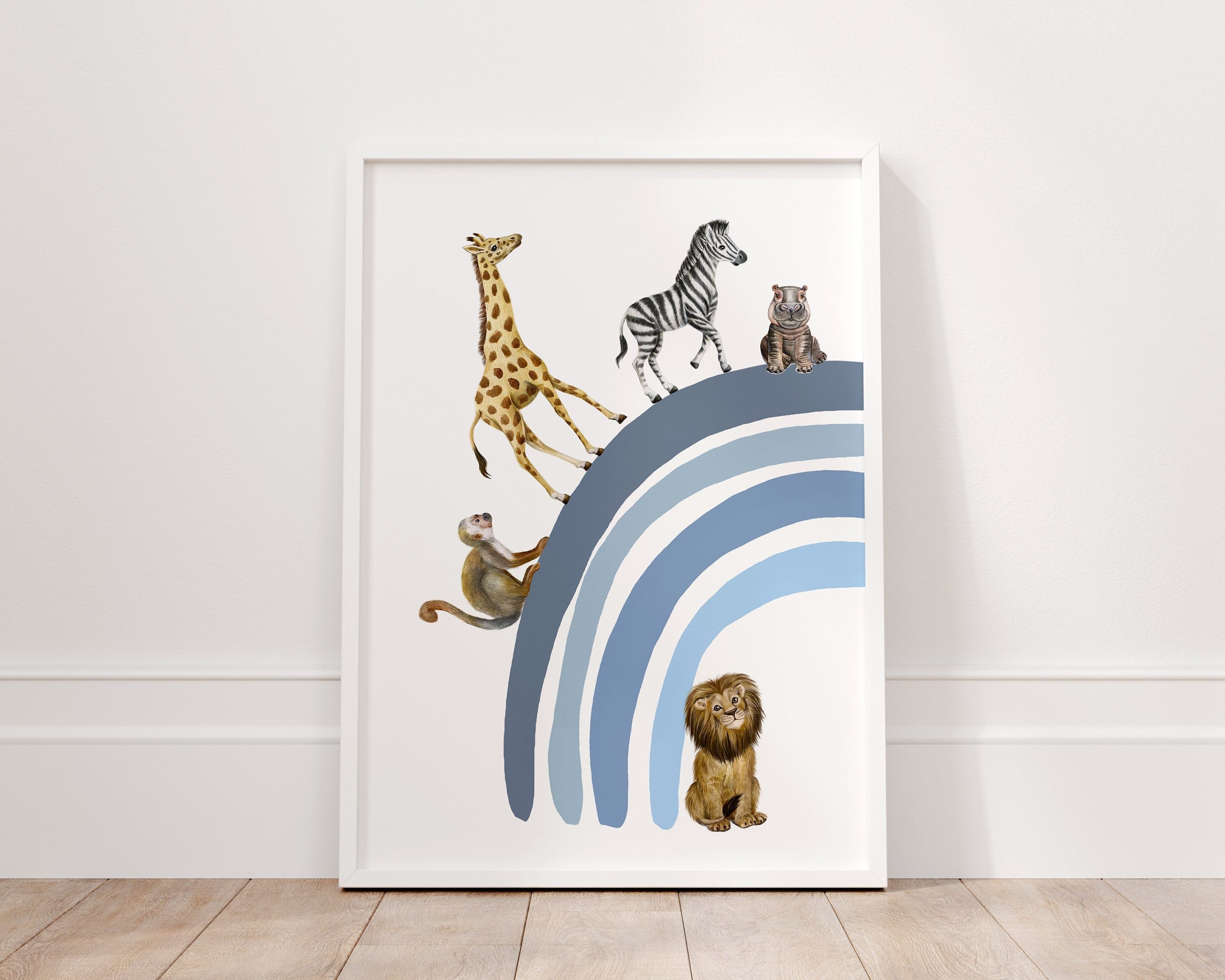 Add a touch of whimsy and adventure to your nursery with this Safari Animal Prints Set of 3 in a charming blue Rainbow safari theme. These Blue Nursery Posters are perfect for adding a playful Boho touch to your little one’s space. Featuring a combination of beloved safari animals including elephant, giraffe, zebra, monkey, lion, lioness, and hippo, this set also includes a delightful hot air balloon blue print with giraffe, lion, zebra, and elephant in the basket. Create a Safari neutral Rainbow Nursery Decor that sparks imagination and joy with these beautifully illustrated prints. Perfect for baby boys, these posters will be a delightful addition to your nursery decor.