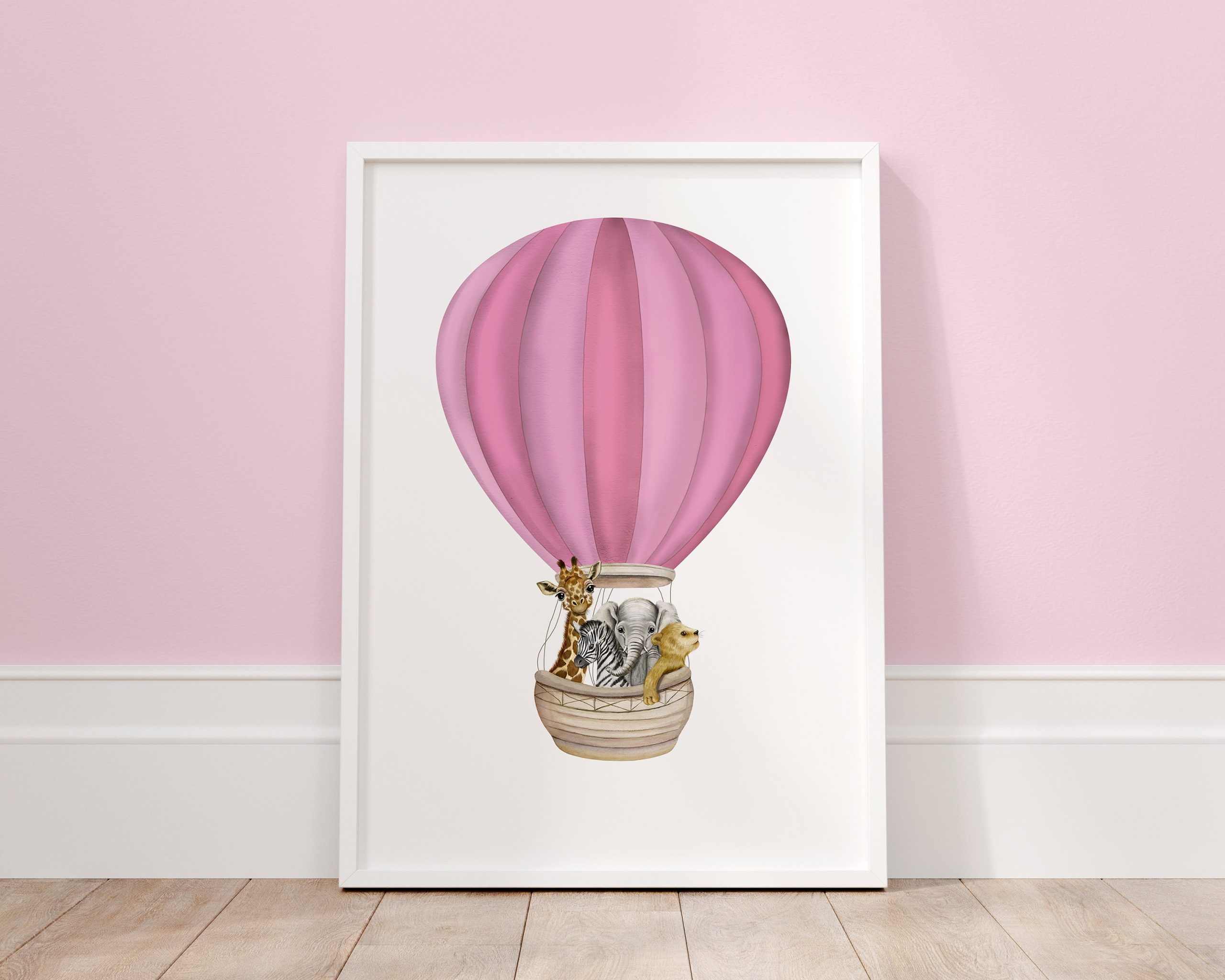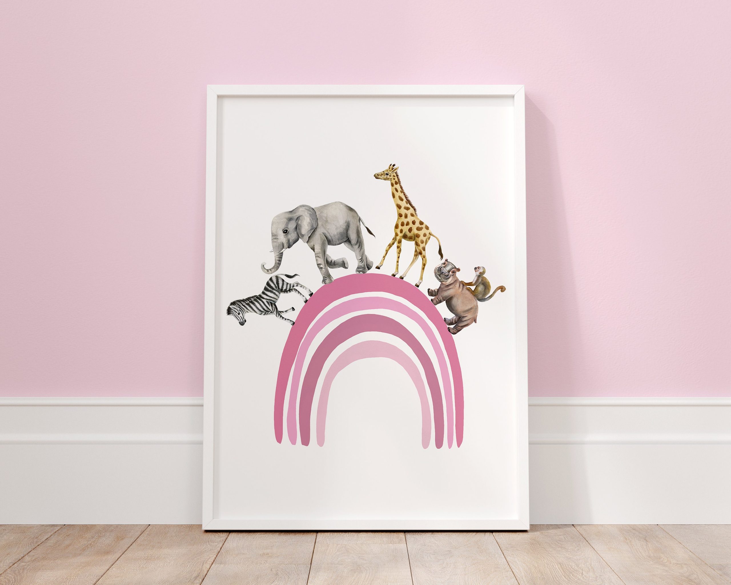 Transform your baby girl’s nursery into a whimsical safari wonderland with this set of 2 pink hot air balloon and rainbow safari animal prints. Featuring a charming assortment of giraffes, elephants, zebras, lions, hippos, and monkeys, these prints add a playful touch to any nursery decor. The soft pink hues of the hot air balloon and rainbow create a soothing and serene atmosphere, perfect for your little one to drift off to dreamland. Add a touch of adventure and sweetness to her bedroom with these adorable Safari Animal Prints. If you would like alternative colours, please reach out and will be happy to accommodate.