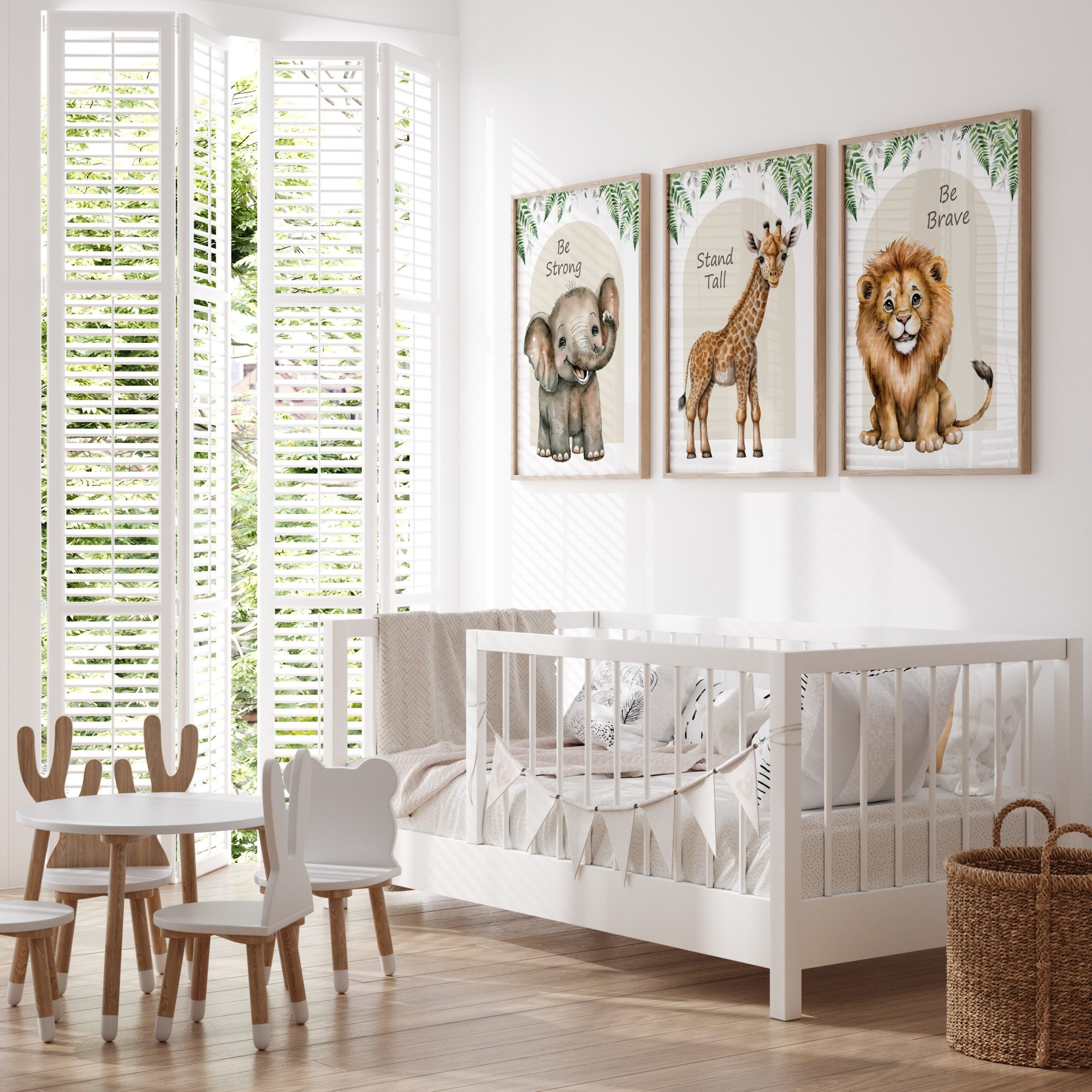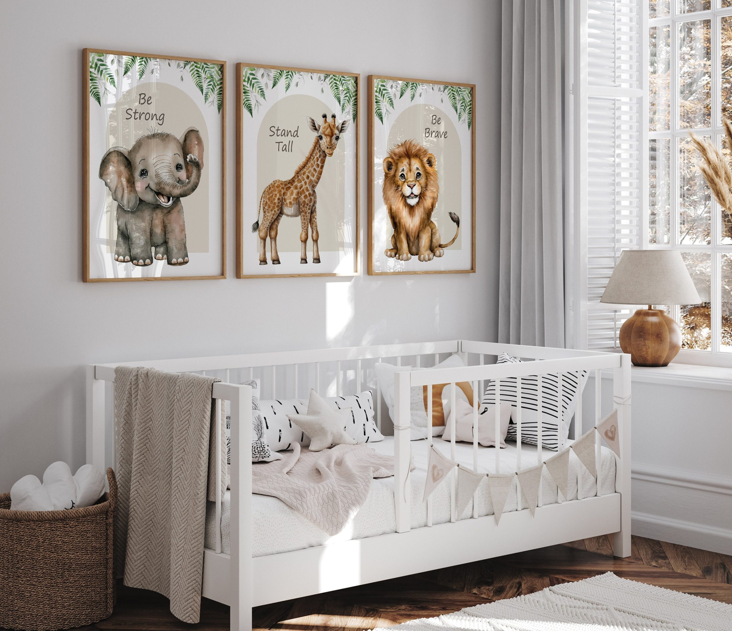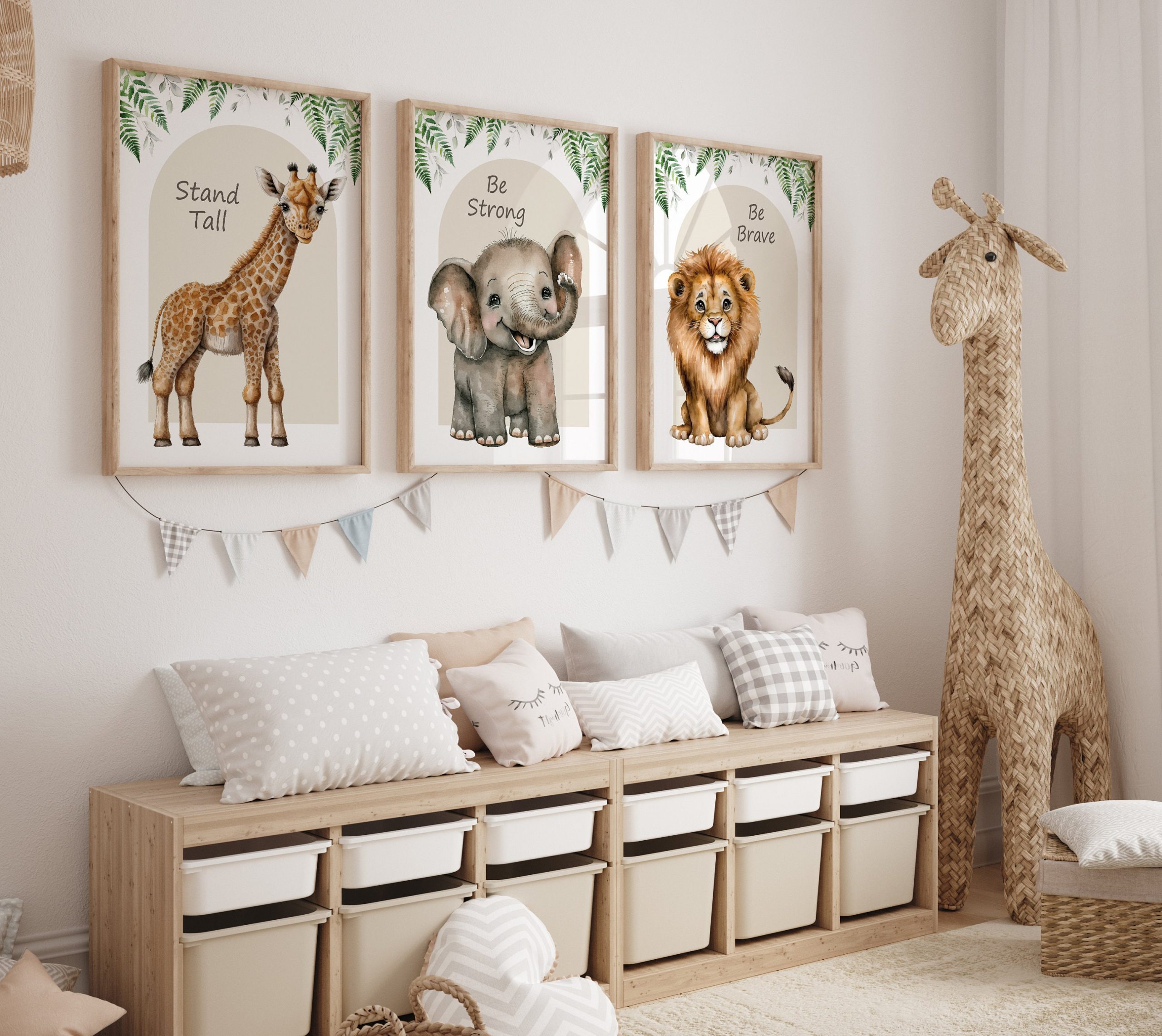 Transform your little one’s nursery or playroom into a whimsical safari wonderland with this charming set of 3 prints featuring a playful elephant, elegant giraffe, and majestic lion. Perfect for a baby boy’s nursery or a baby girl’s room, these neutral wall art pictures in soothing shades of beige will add a touch of serenity and style to any space. Each print is lovingly crafted to inspire imagination and create a cosy atmosphere for your little explorer to thrive in. Each print includes the inspirational quote “Stand tall, be brave, dream big”, making them not only decorative but also motivational. Elevate your decor with these adorable animal prints and make your child’s space truly special.