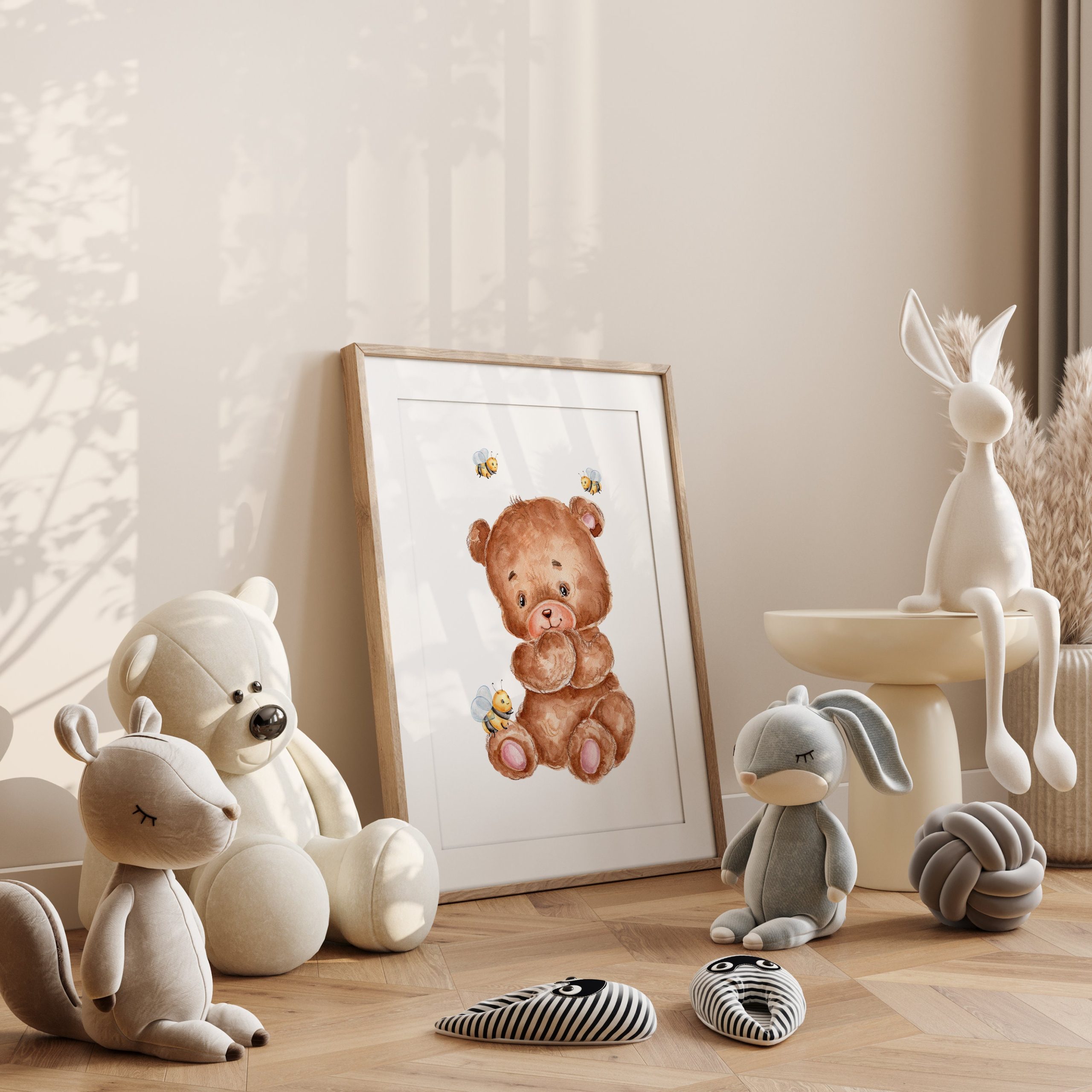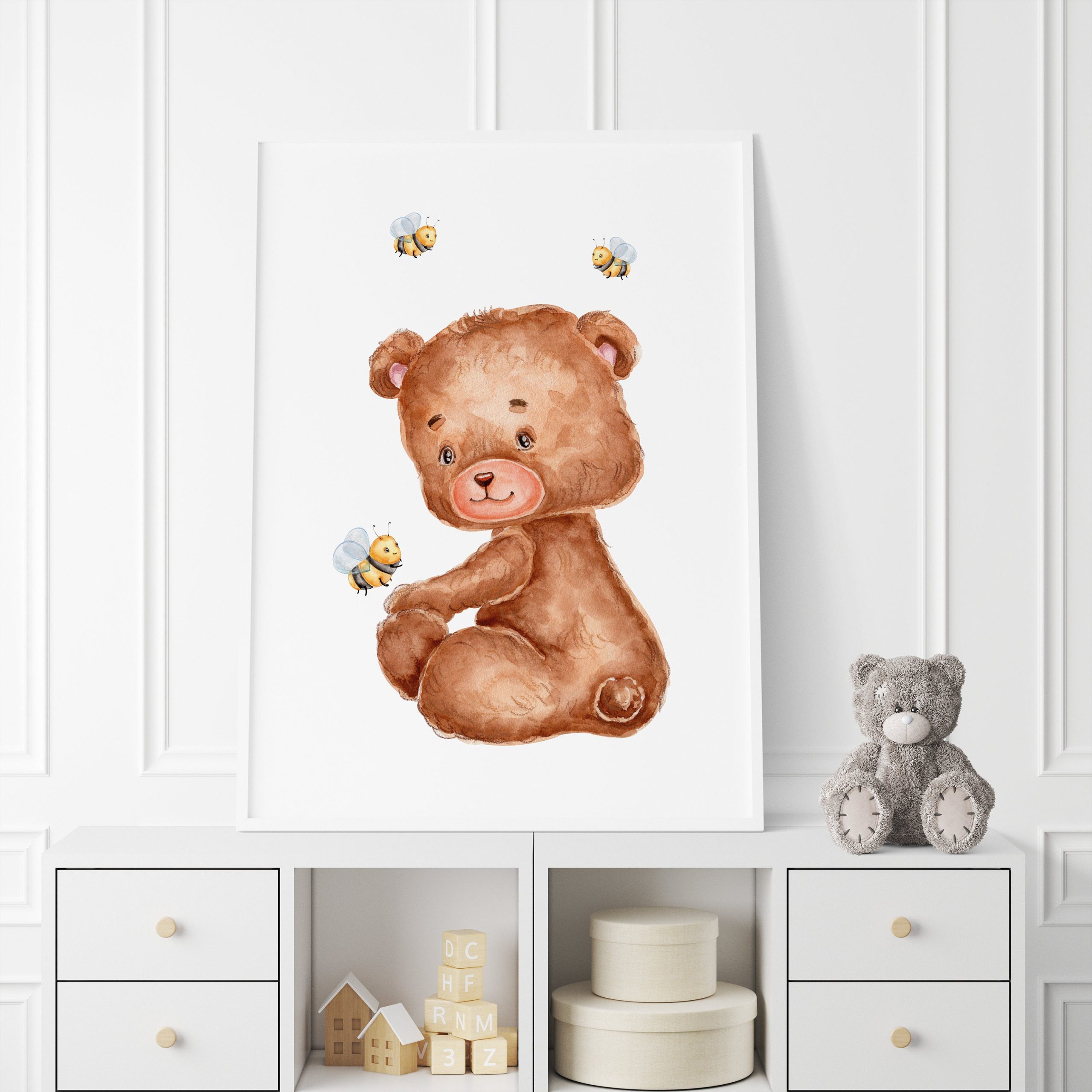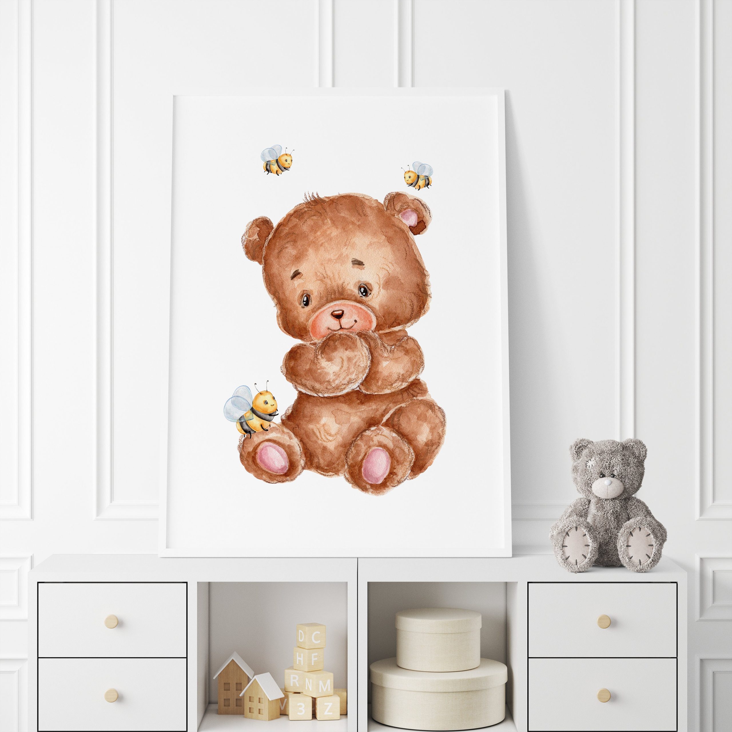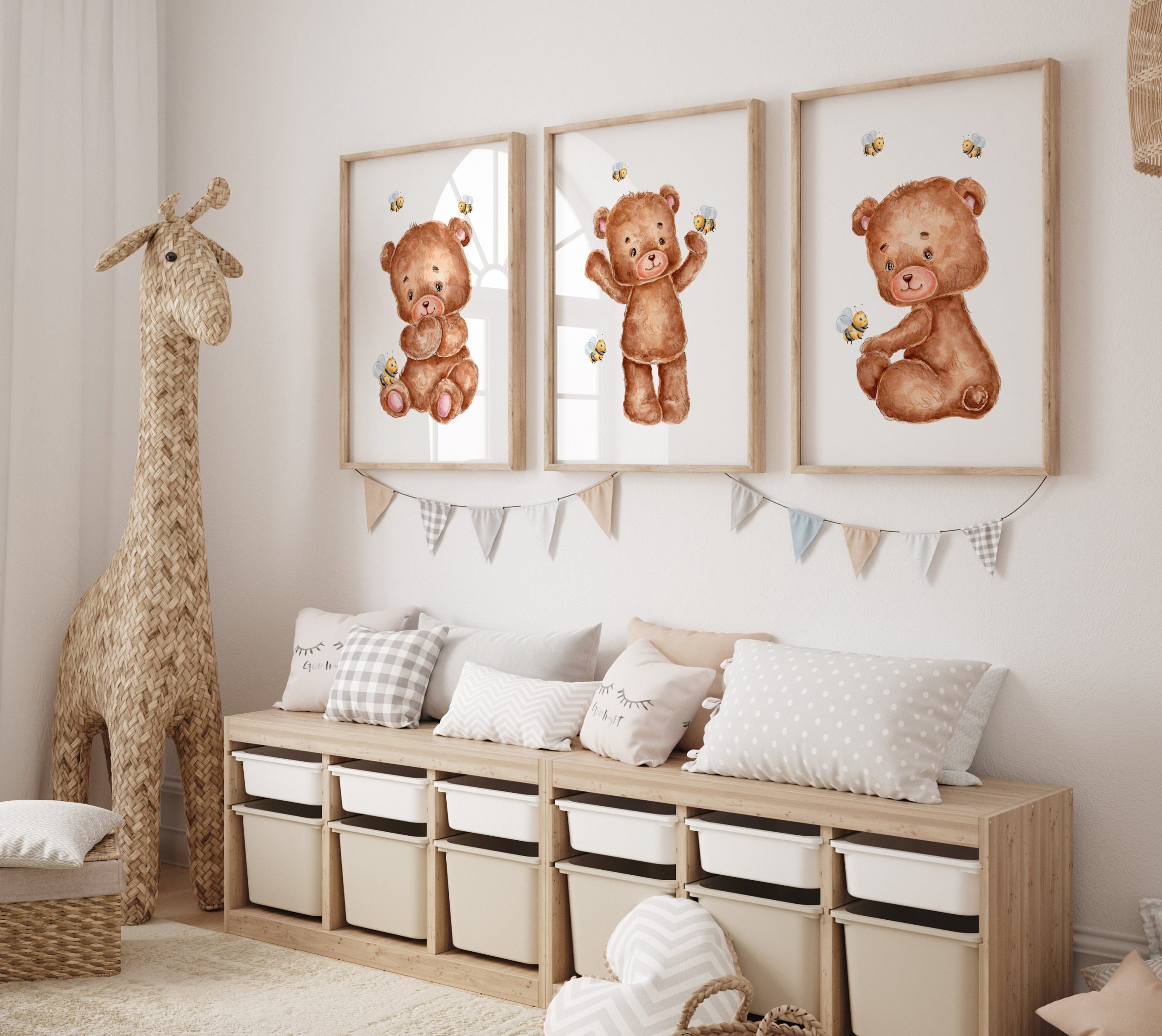 Introducing this charming set of 3 teddy bear prints for the nursery! Adorned with adorable brown teddy bears showcasing different positions, accompanied by their cute friend bubble bees, these nursery wall art pieces are the perfect addition to your baby boy or girl’s room. These bear wall posters bring a touch of whimsy and joy to any children’s bedroom or playroom decor. Let these sweet bears and their buzzing buddies bring smiles and warmth to your little one’s space!
